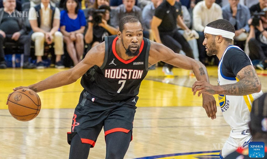 Kevin Durant (L) of Houston Rockets breaks through against Gary Payton II of Golden State Warriors during the 2025-2026 NBA regular season basketball game between Houston Rockets and Golden State Warriors in San Francisco, the United States, April 5, 2026. (Photo by Arthur Dong/Xinhua)