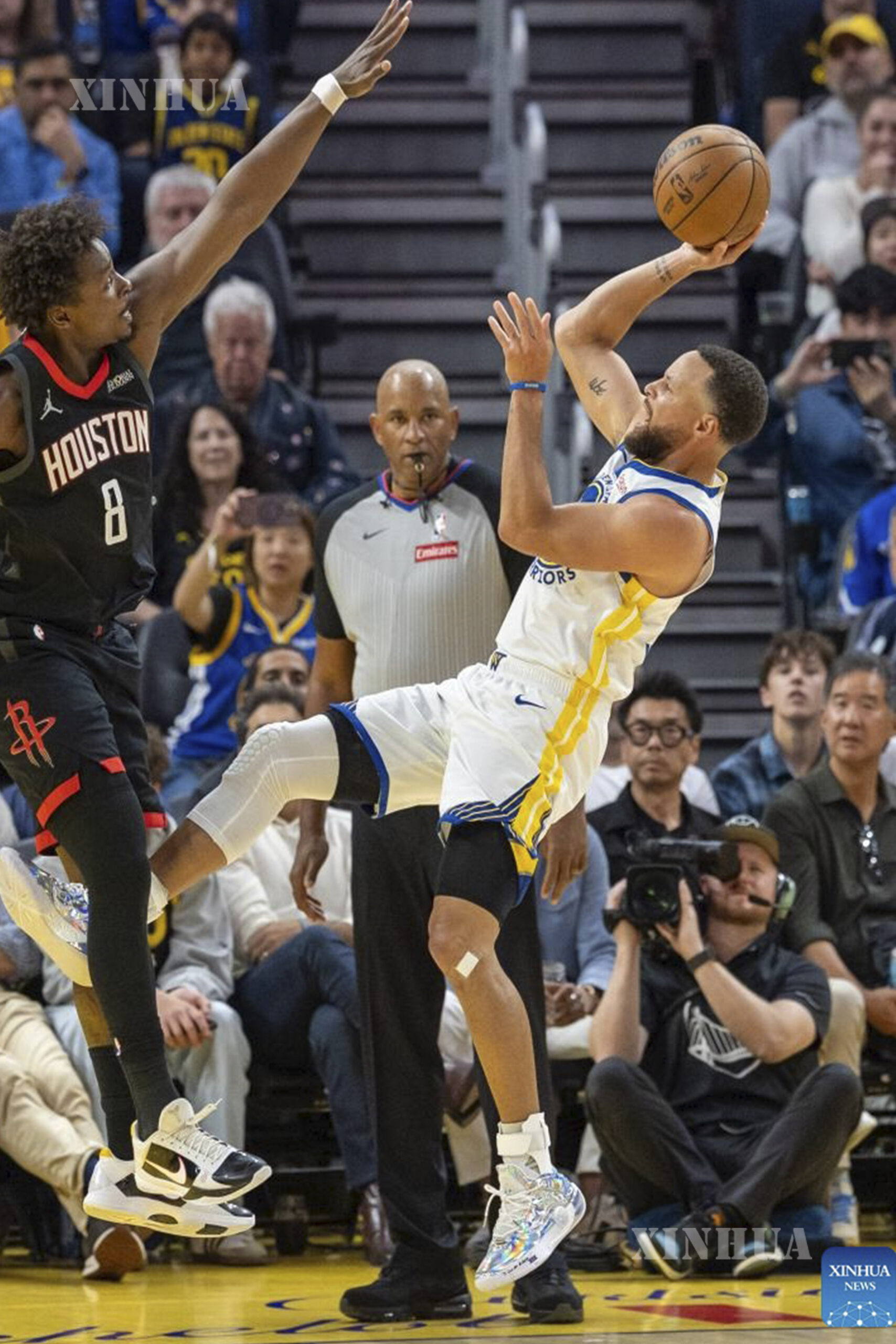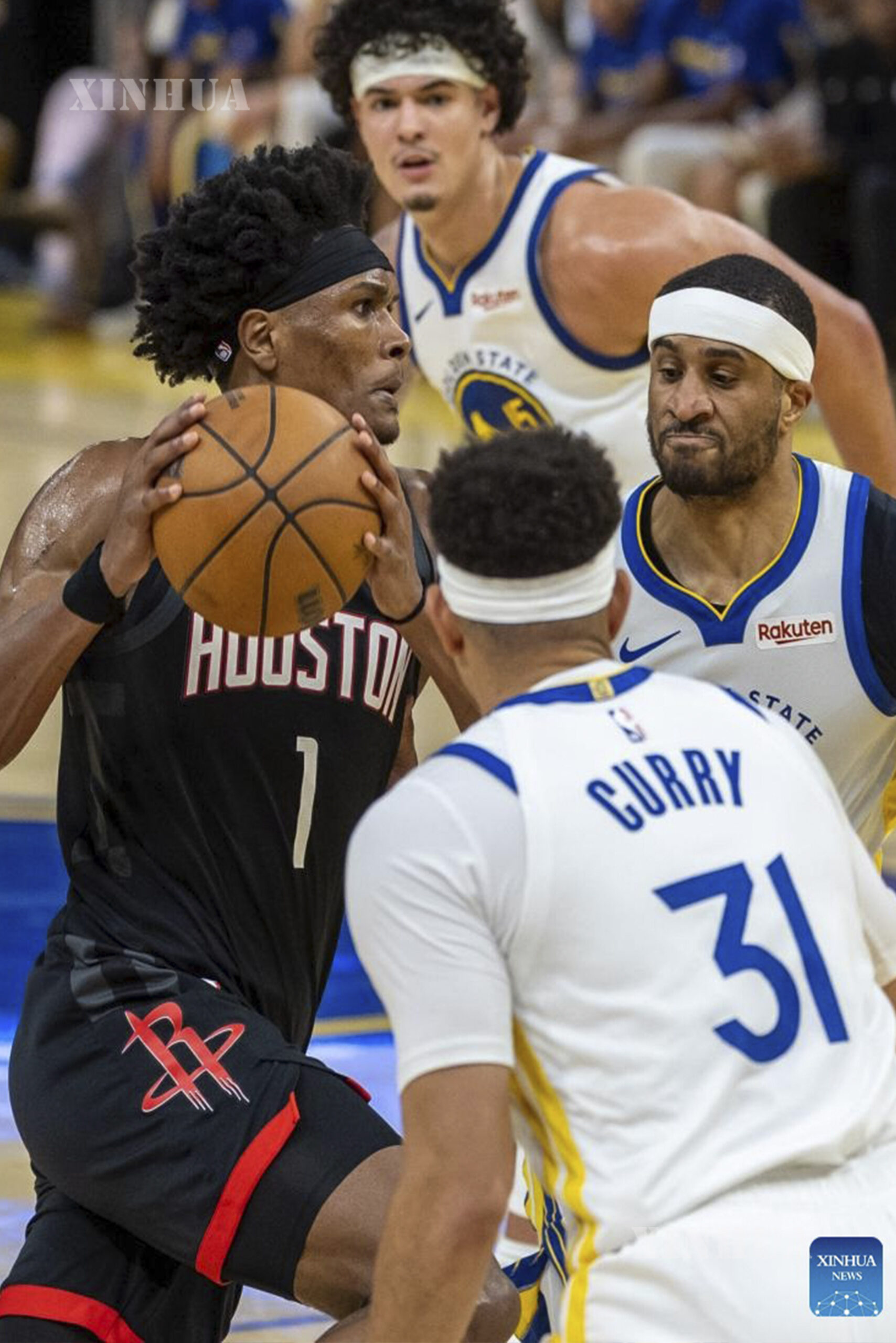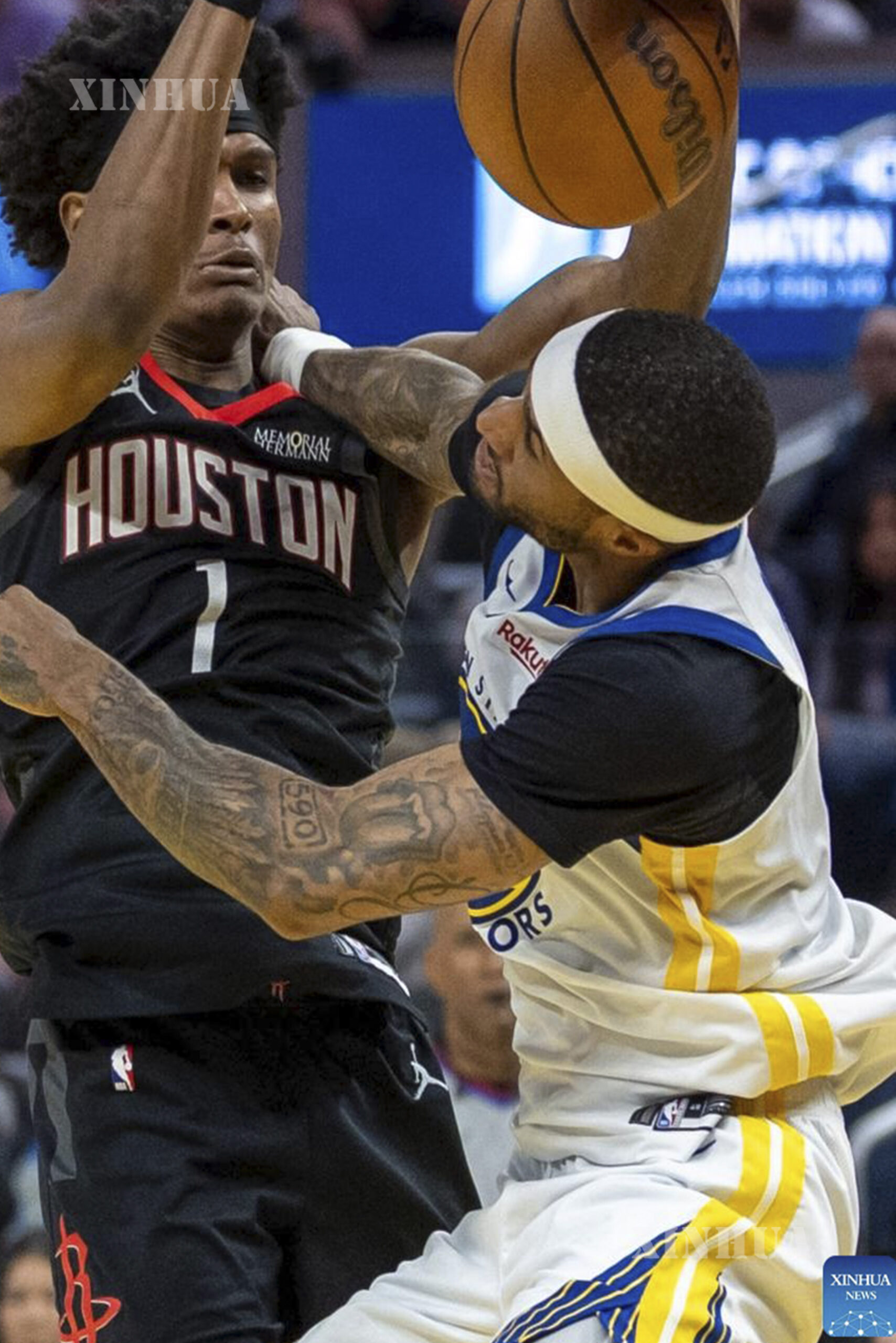 ၂၀၂၅-၂၀၂၆ NBA ပုံမှန်ရာသီ ဘတ်စကက်ဘောပွဲစဉ်အဖြစ် ဟူစတန် ရော့ကက်စ်အသင်းနှင့် ဂိုးလ်ဒင်း စတိတ် ဝေါ်ရီယာစ်အသင်းတို့ ယှဉ်ပြိုင်ကစားသည့် ပုံရိပ်များ (Xinhua)