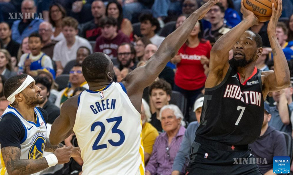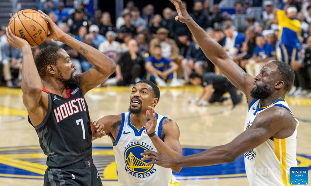 Kevin Durant (R) of Houston Rockets controls the ball against Draymond Green (C) and Gary Payton II of Golden State Warriors during the 2025-2026 NBA regular season basketball game between Houston Rockets and Golden State Warriors in San Francisco, the United States, April 5, 2026. (Photo by Arthur Dong/Xinhua)