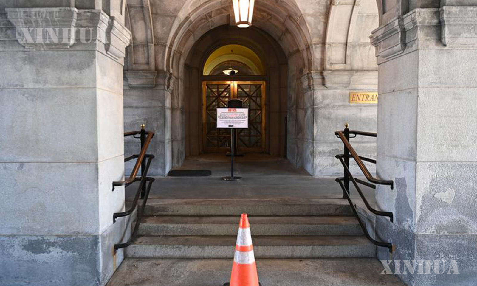 3. 10月1日,在美国华盛顿的国会图书馆外,公告牌显示国会图书馆因美国联邦政府“停摆”而关闭。新华社记者 李睿 摄