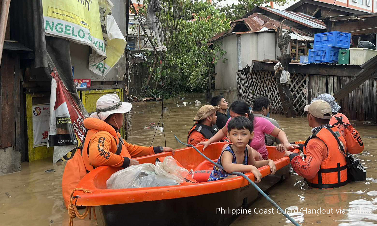 ဖိလစ်ပိုင်နိုင်ငံ စီဘူးပြည်နယ်တွင် ကယ်ဆယ်ရေးဝန်ထမ်းများက ဘေးသင့်ပြည်သူများ နေရာရွှေ့ပြောင်းရန် ကူညီပေးနေသည်ကို ၂၀၂၅ ခုနှစ် နိုဝင်ဘာ ၄ ရက်က တွေ့ရစဉ် (ဓာတ်ပုံ – Philippine Coast Guard/Handout via Xinhua)