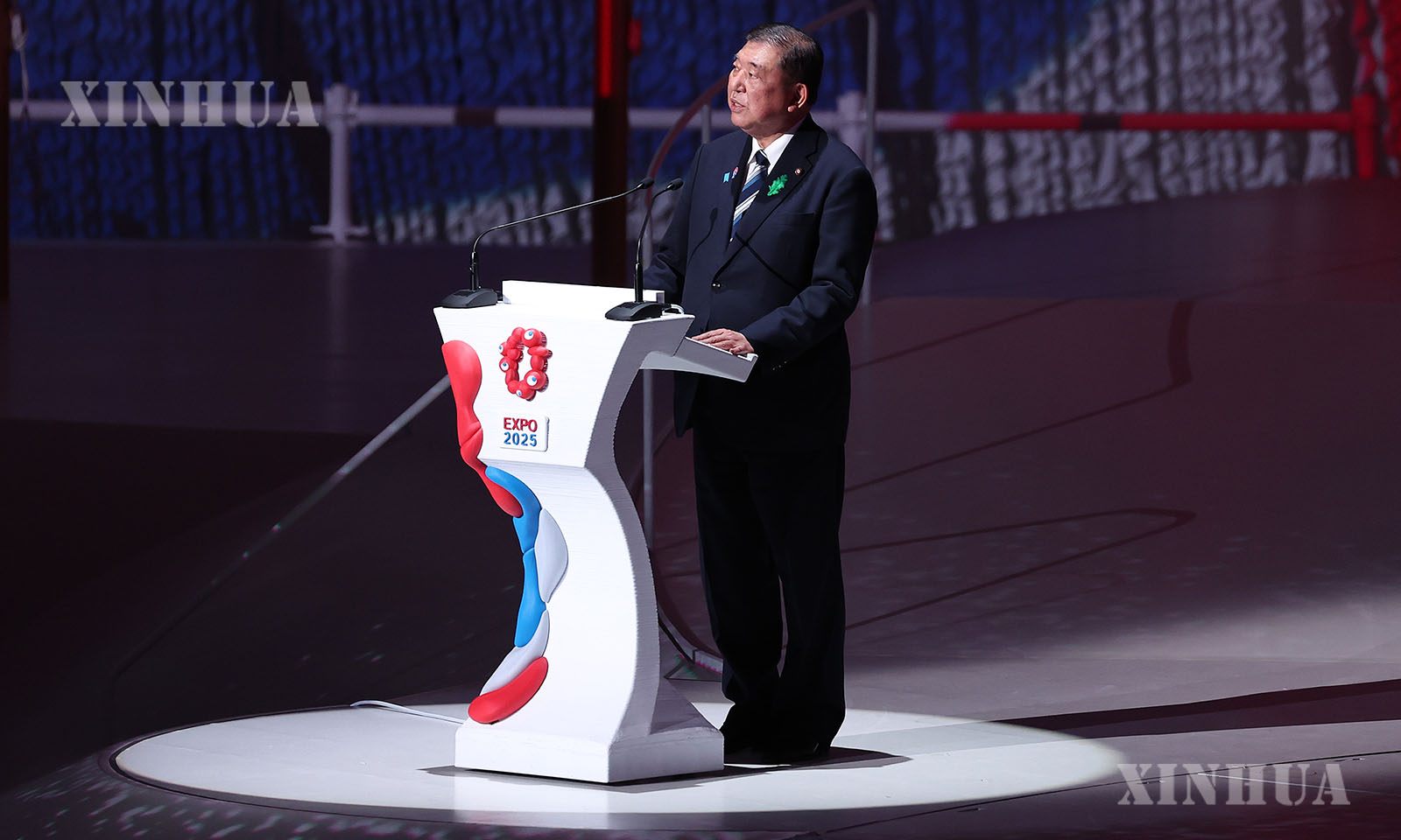 ဂျပန်နိုင်ငံ ကန်ဆိုင်းဒေသ အိုဆာကာမြို့တွင် ကျင်းပသော ၂၀၂၅ ခုနှစ် ကမ္ဘာ့ကုန်စည်ပြပွဲ ဖွင့်ပွဲအခမ်းအနား၌ ရှိဂဲရုအီရှီဘာ အမှာစကားပြောကြားနေသည်ကို ၂၀၂၅ ခုနှစ် ဧပြီ ၁၂ ရက်က တွေ့ရသော မှတ်တမ်းဓာတ်ပုံ (ဆင်ဟွာ)