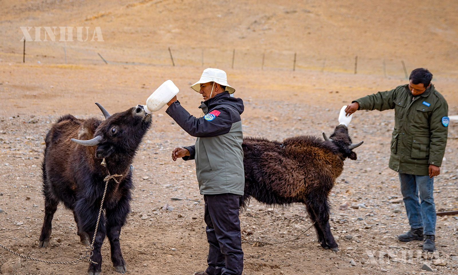 တရုတ်နိုင်ငံ ရှီးဇန့်ဒေသ ချန်းထန် အမျိုးသားသဘာဝပတ်ဝန်းကျင် ထိန်းသိမ်းရေးဇုန်တွင် နာ့ချွီဒေသ စီမံခန့်ခွဲရေးဌာန တောရိုင်းတိရစ္ဆာန် အထူးစောင့်ရှောက်ရေးဝန်ထမ်း လော်ပု (ဝဲဘက်) နှင့် လုပ်ဖော်ကိုင်ဖက်က လက်ခံမွေးမြူထားသော တောရိုင်း စာမရီနွားလေးအား နို့တိုက်နေသည်ကို ၂၀၂၆ ခုနှစ် ဧပြီ ၈ ရက်က တွေ့ရစဉ် (ဆင်ဟွာ)