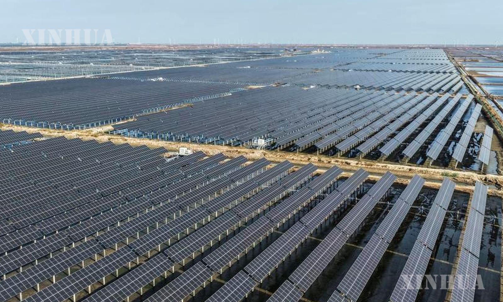 Photo : An aerial drone photo taken on Nov. 16, 2025 shows a 240-megawatt photovoltaic power generation project in Dongying City, east China’s Shandong Province. (Photo by Liu Yunjie/Xinhua)