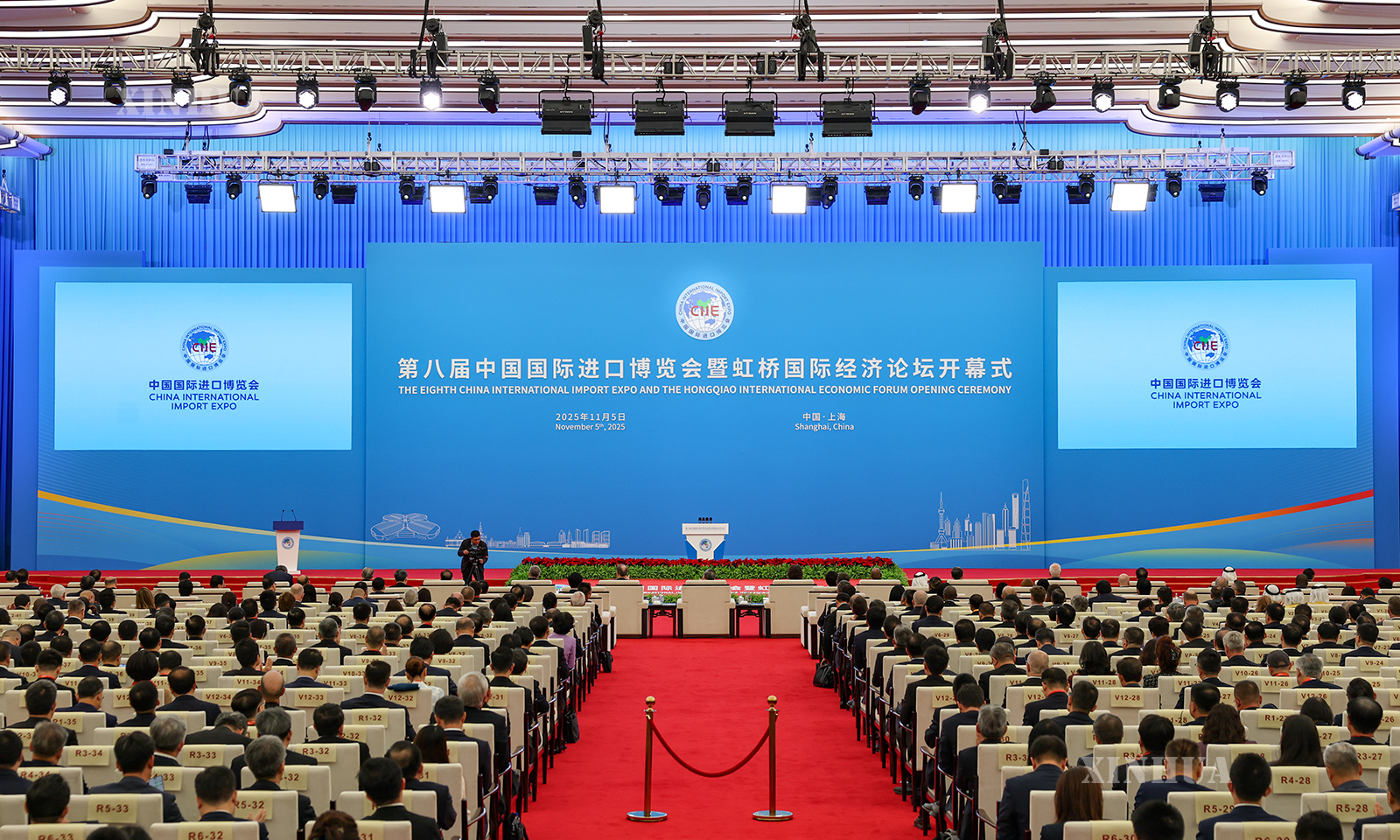 Photo: This photo taken on Nov. 5, 2025 shows a scene at the opening ceremony of the eighth China International Import Expo (CIIE) and the Hongqiao International Economic Forum in Shanghai, east China. (Xinhua/Wang Zecong)