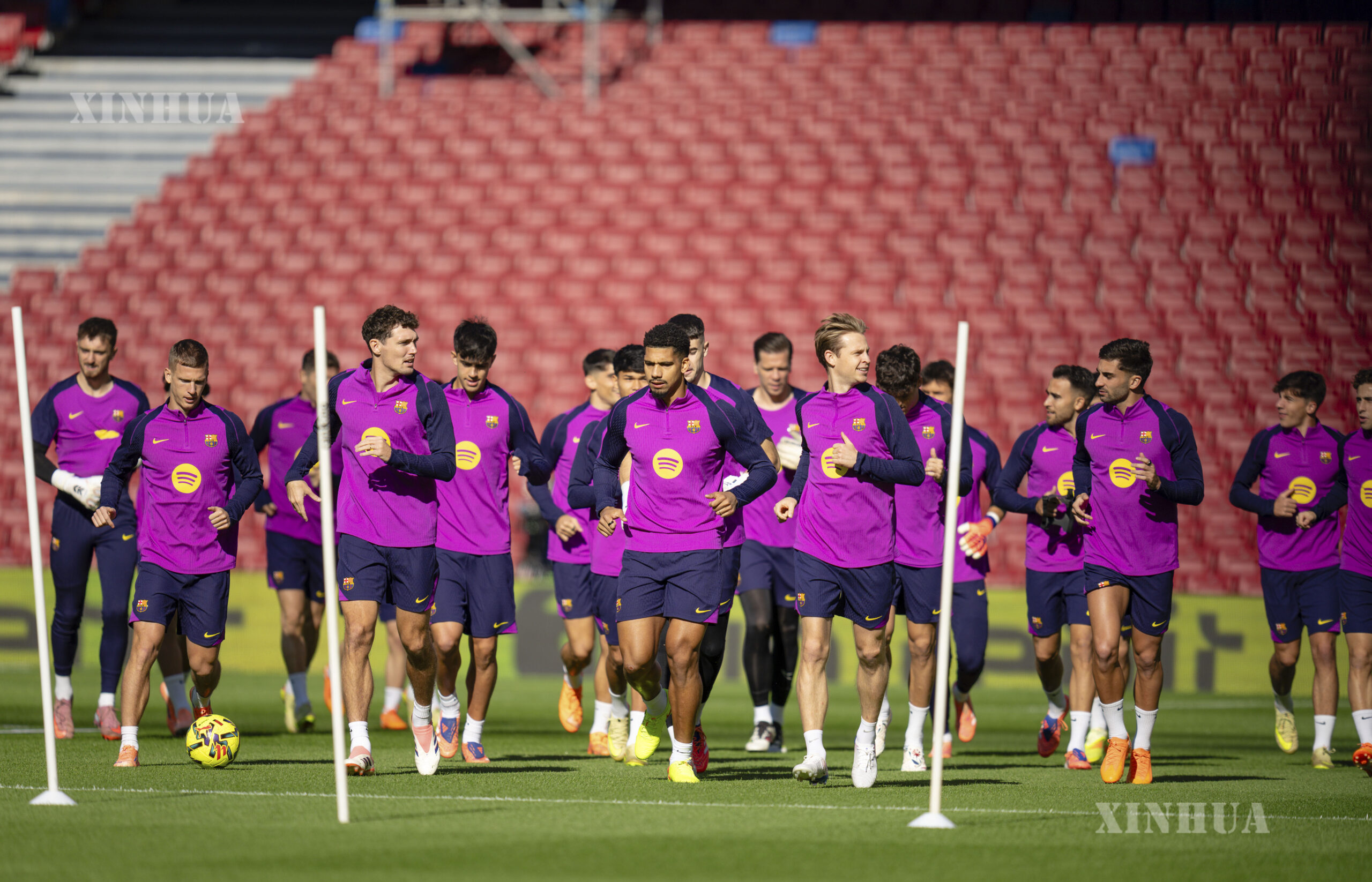 နူးကမ့်ကွင်းအား ပြန်လည်မွမ်းမံတည်ဆောက်ပြီးနောက် အဆိုပါကွင်း၌ ပထမဆုံးအကြိမ် လေ့ကျင့်ခန်းဆင်းနေသည့် ဘာစီလိုနာ ကစားသမားများအား တွေ့ရစဉ် (ဆင်ဟွာ)