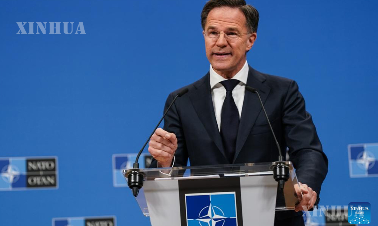 ဘယ်လ်ဂျီယမ်နိုင်ငံ ဘရပ်ဆဲလ်မြို့တွင် ပြုလုပ်သည့် သတင်းစာရှင်းလင်းပွဲ၌ မြောက်အတ္တလန္တိတ် စာချုပ်ဝင်နိုင်ငံများအဖွဲ့ (နေတိုး) အထွေထွေအတွင်းရေးမှူးချုပ် မာ့ခ်ရူတေး ရှင်းလင်းပြောကြားနေပုံကို ၂၀၂၆ ခုနှစ် မတ် ၂၆ ရက်က တွေ့ရစဉ် (ဆင်ဟွာ)