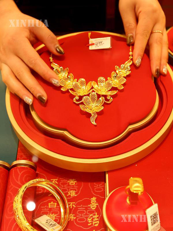 တရုတ်နိုင်ငံ ကျန်းဆူးပြည်နယ် လျန်ယွင်ကန်မြို့ လျန်ယွင်ခရိုင်ရှိ ရွှေဆိုင်တစ်ဆိုင်တွင် အရောင်းဝန်ထမ်းတစ်ဦးက ရွှေထည်ပစ္စည်းများ စီရီနေသည်ကို ၂၀၂၆ ခုနှစ် ဇန်နဝါရီ ၂၉ ရက်က တွေ့ရစဉ် (ဆင်ဟွာ)