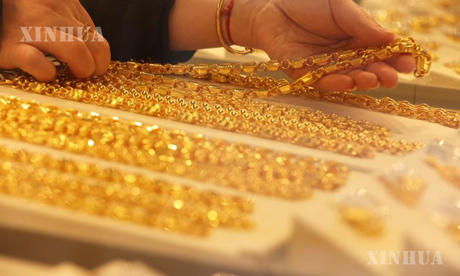 3. 1月29日,在浙江省湖州市德清县禹越镇的一家金店,店员在整理黄金首饰。新华社发(倪立芳摄)