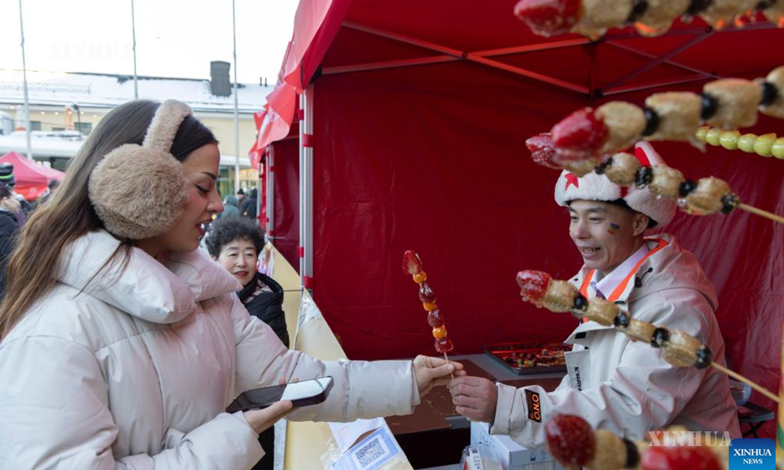 ဖင်လန်နိုင်ငံ မြို့တော်ဟယ်ဆင်ကီ၌ ကျင်းပသည့် ၂၀၂၆ ခုနှစ် “ပျော်ရွှင်ဖွယ်ရာ တရုတ်နှစ်သစ်ကူး” ရိုးရာပွဲဈေးအတွင်း အစားအစာအရောင်းဆိုင်၌ တရုတ်ရိုးရာအဆာပြေမုန့် ဝယ်ယူနေသည့် ပွဲဈေးလာသူတစ်ဦးကို ၂၀၂၆ ခုနှစ် ဖေဖော်ဝါရီ ၁၃ ရက်က တွေ့ရစဉ် (ဆင်ဟွာ)