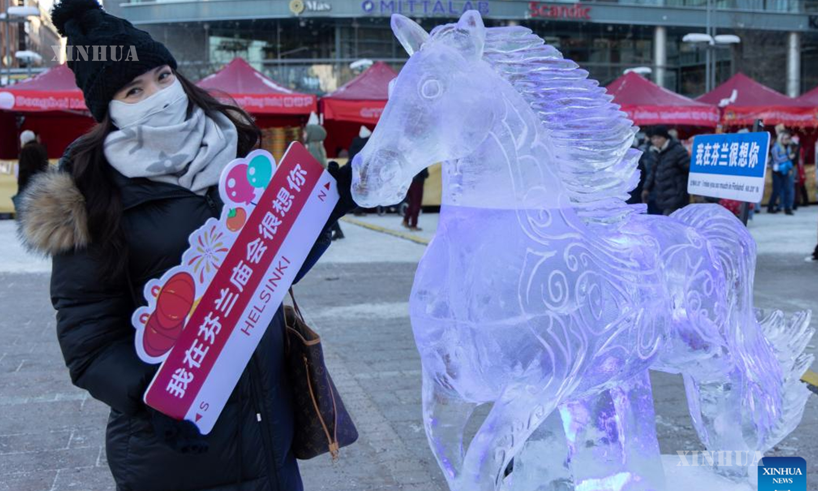 င်လန်နိုင်ငံ မြို့တော်ဟယ်ဆင်ကီ၌ ကျင်းပသည့် ၂၀၂၆ ခုနှစ် “ပျော်ရွှင်ဖွယ်ရာ တရုတ်နှစ်သစ်ကူး” ရိုးရာပွဲဈေးတွင် မြင်းနှစ်အထိမ်းအမှတ် ထုလုပ်ထားသော ရေခဲပန်းပုရုပ်တုနှင့်အတူ အမှတ်တရဓာတ်ပုံတွဲရိုက်နေသည့် ပွဲဈေးလာသူတစ်ဦးကို ၂၀၂၆ ခုနှစ် ဖေဖော်ဝါရီ ၁၃ ရက်က တွေ့ရစဉ် (ဆင်ဟွာ)