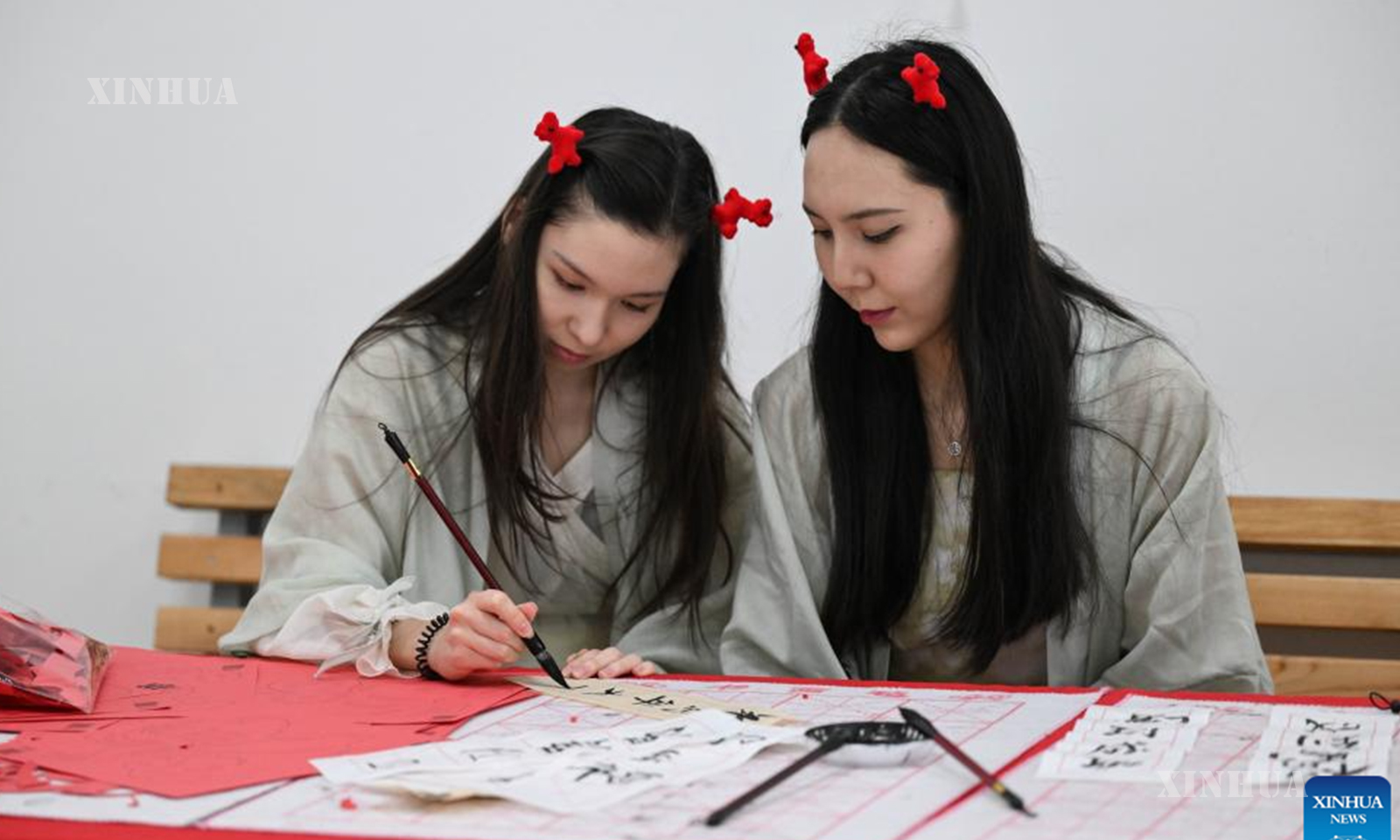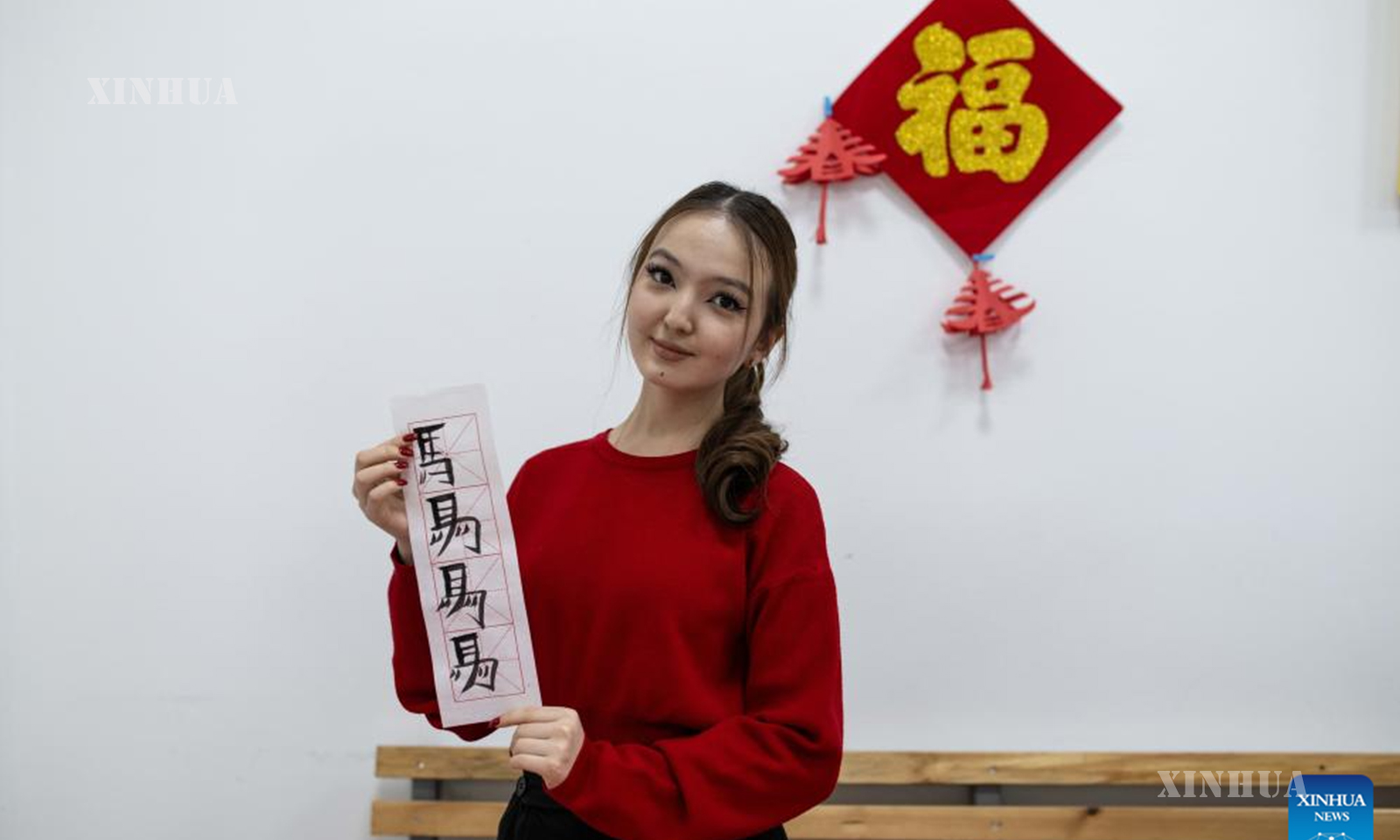 ကာဇက်စတန်နိုင်ငံ အယ်လ်မာတီမြို့၌ ကျင်းပပြုလုပ်သည့် တရုတ်နှစ်သစ်ကူး ယဉ်ကျေးမှုဆိုင်ရာ ပွဲအခမ်းအနားအတွင်း တရုတ်စာလုံး လက်ရေးလှလေ့ကျင့်ရေးသားနေသည့် Al-Farabi Kazakh အမျိုးသားတက္ကသိုလ်ရှိ ကွန်ဖြူးရှပ်အင်စတီကျုမှ ကျောင်းသူ (ဝဲဘက်) ကို ၂၀၂၆ ခုနှစ် ဖေဖော်ဝါရီ ၁၃ ရက်က တွေ့ရစဉ် (ဆင်ဟွာ)