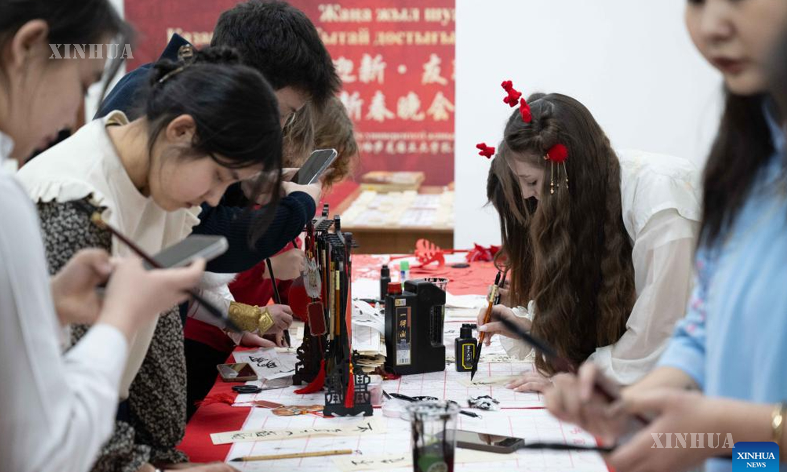 Students from the Confucius Institute at Al-Farabi Kazakh National University practice Chinese calligraphy during a Chinese New Year cultural event in Almaty, Kazakhstan, Feb. 13, 2026. (Xinhua/Li Renzi)