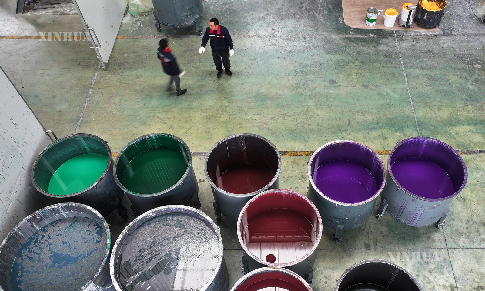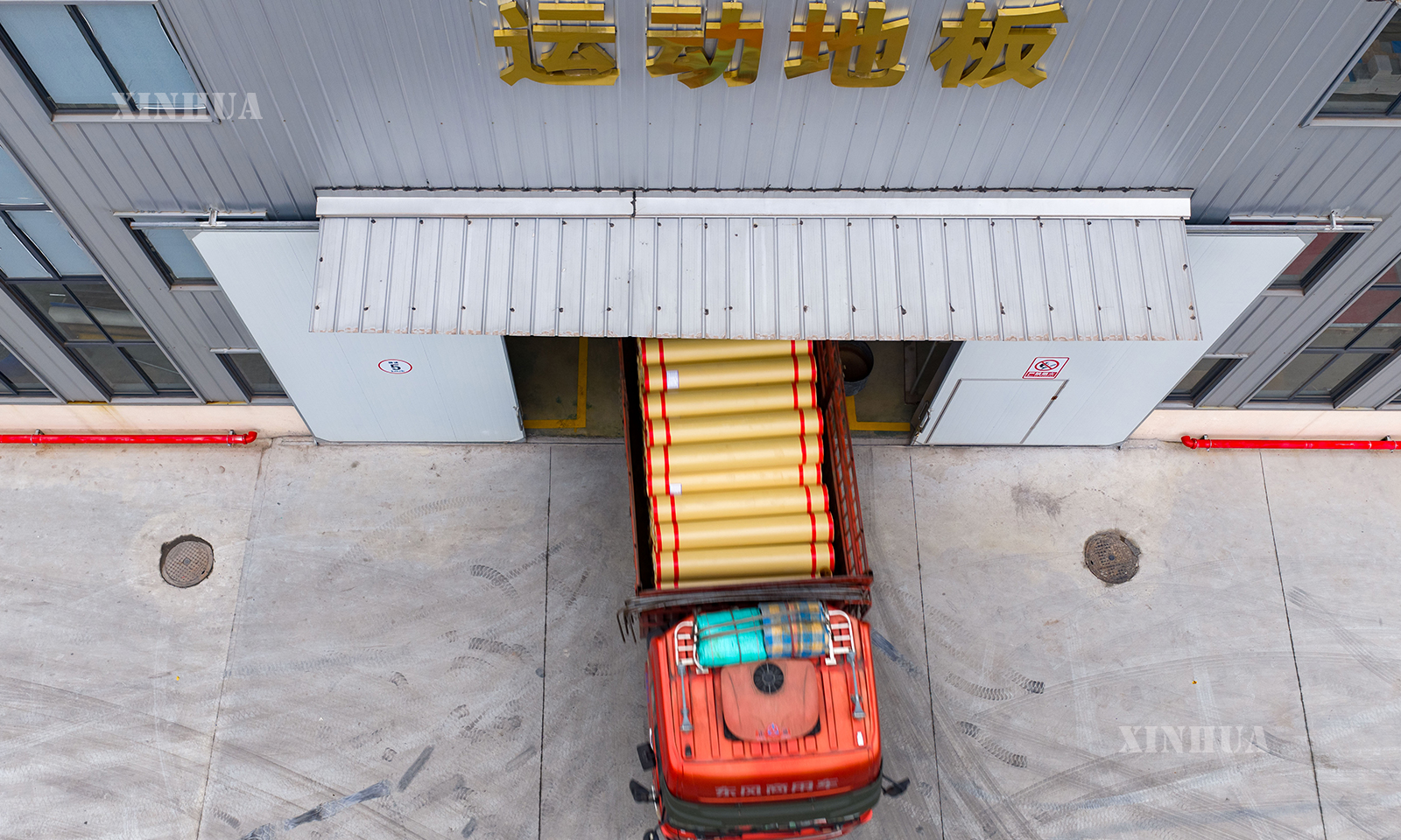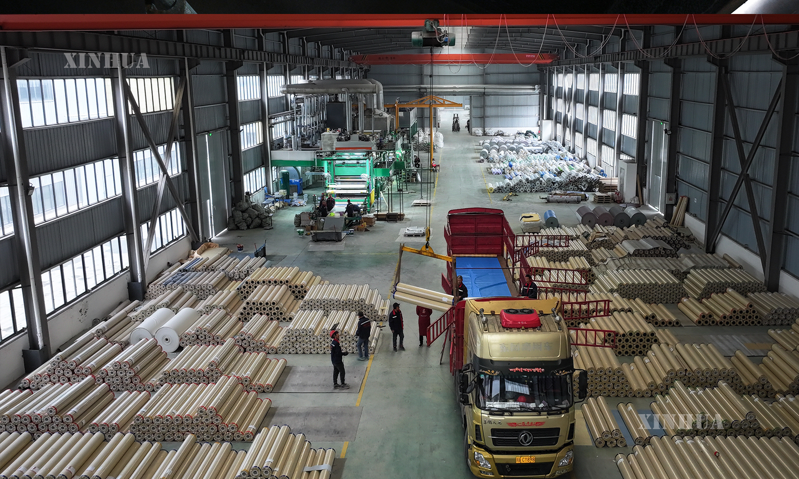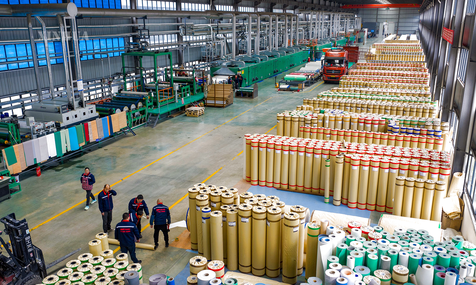 图说1:这是12月12日在四川省广元市拍摄的一家卷材地板制造车间(无人机照片)。 新华社记者 姜帆 摄