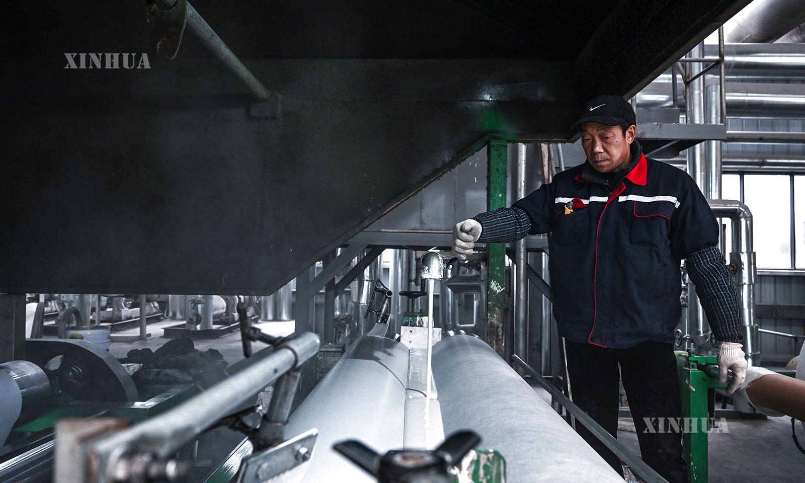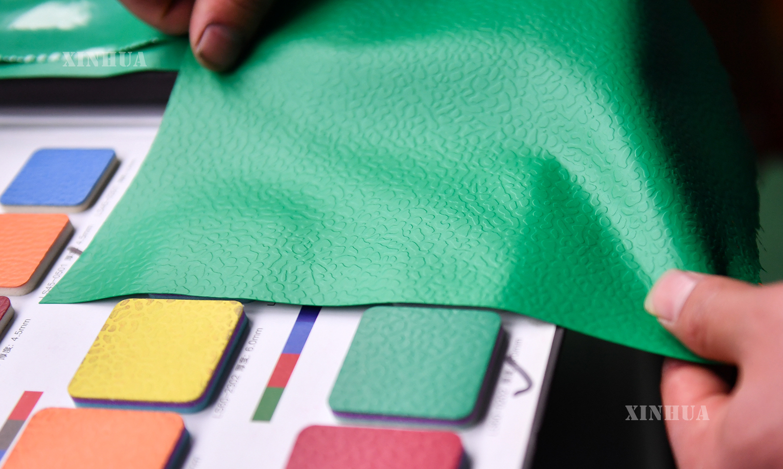 图说2:12月12日,工人在四川省广元市一家卷材地板制造车间比对样品颜色。新华社记者 陈振海 摄