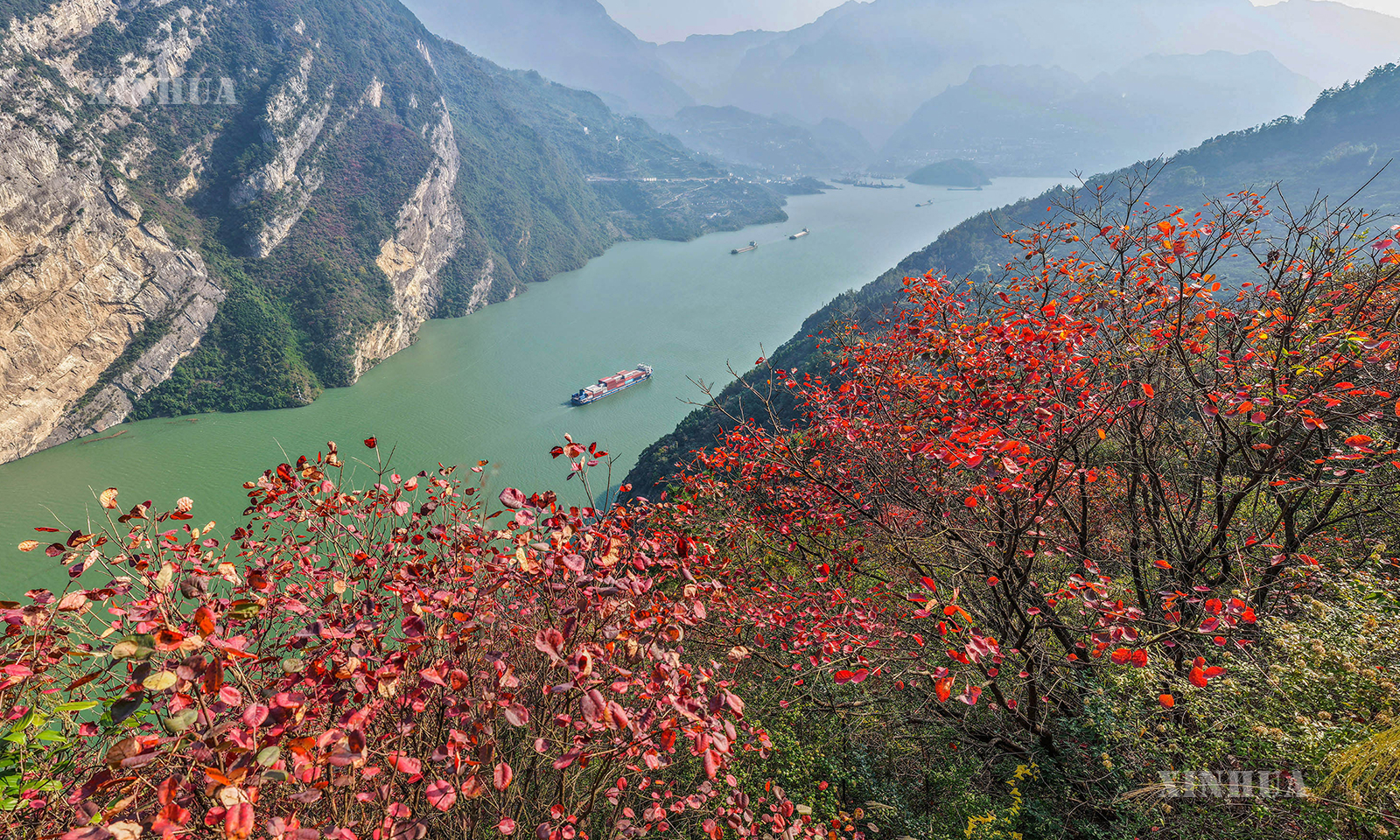 တရုတ်နိုင်ငံ ဟူပေပြည်နယ် ရီချန်းမြို့ ကျီကွေးခရိုင် ရှီးလျင်လျှိုမြောင် ရေပြင်တွင် ခုတ်မောင်းနေသော သင်္ဘောကို ၂၀၂၅ ခုနှစ် နိုဝင်ဘာ ၁၆ ရက်က တွေ့ရစဉ် (ဆင်ဟွာ)