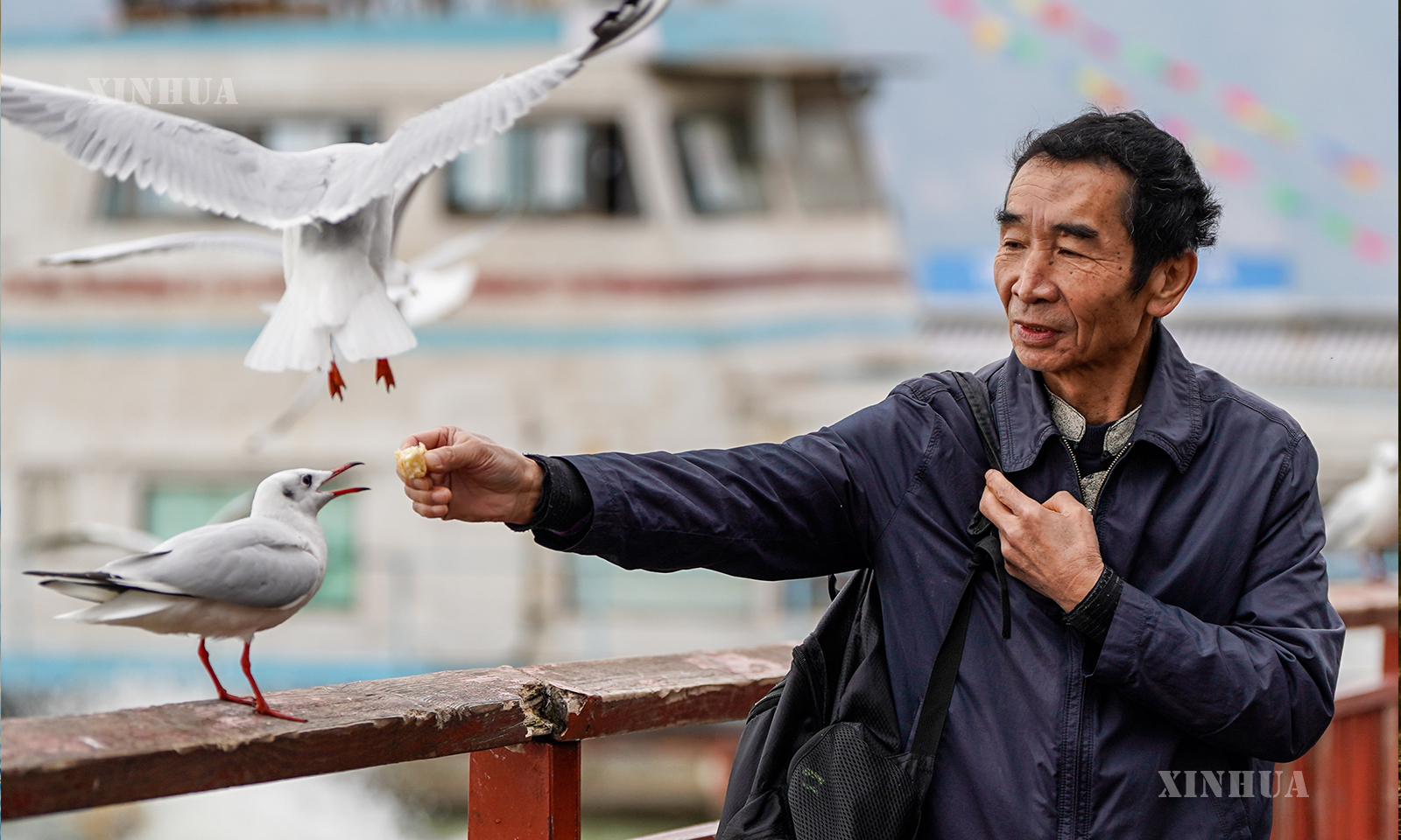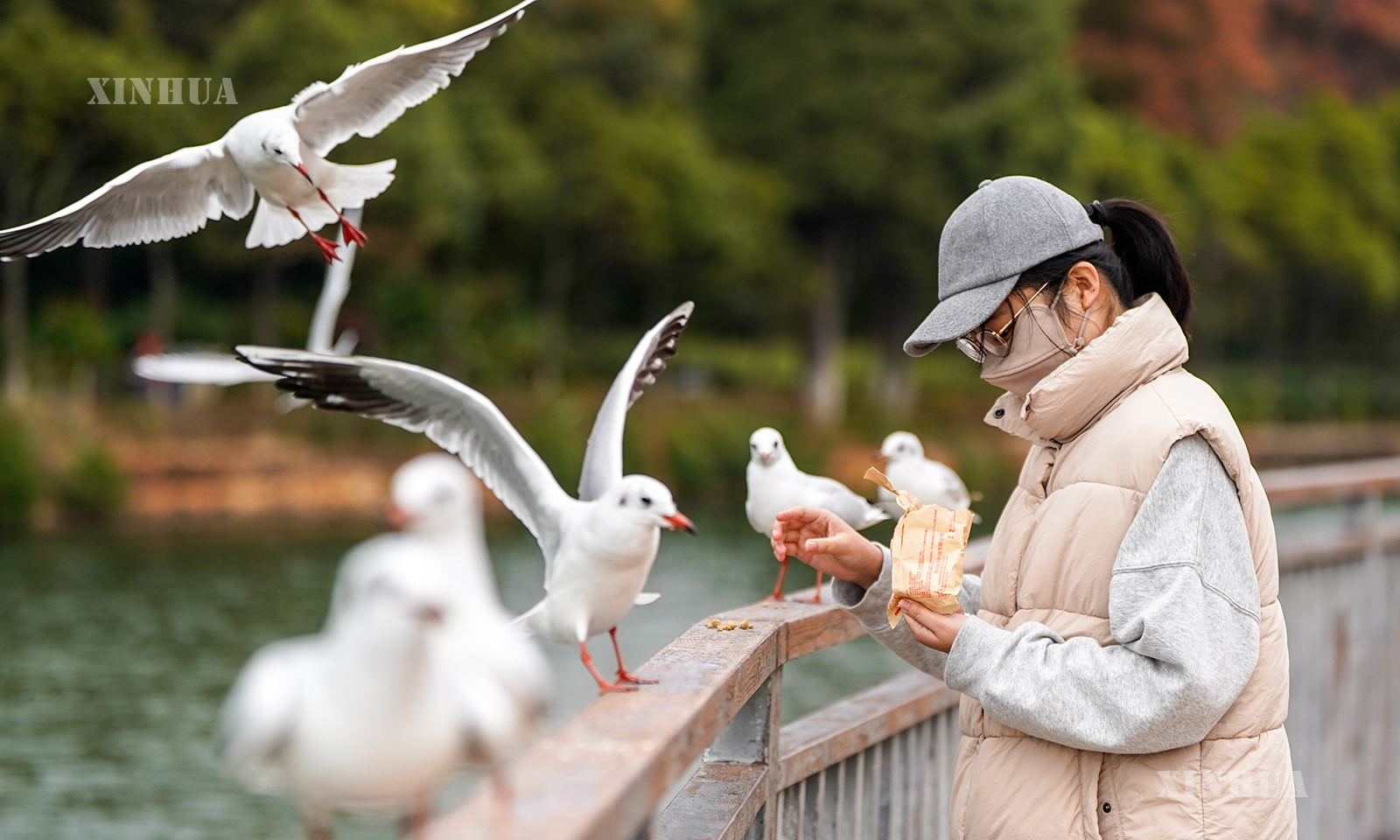 图说2:12月11日,游客在滇池畔的星海半岛生态湿地喂红嘴鸥。新华社记者 彭奕凯 摄