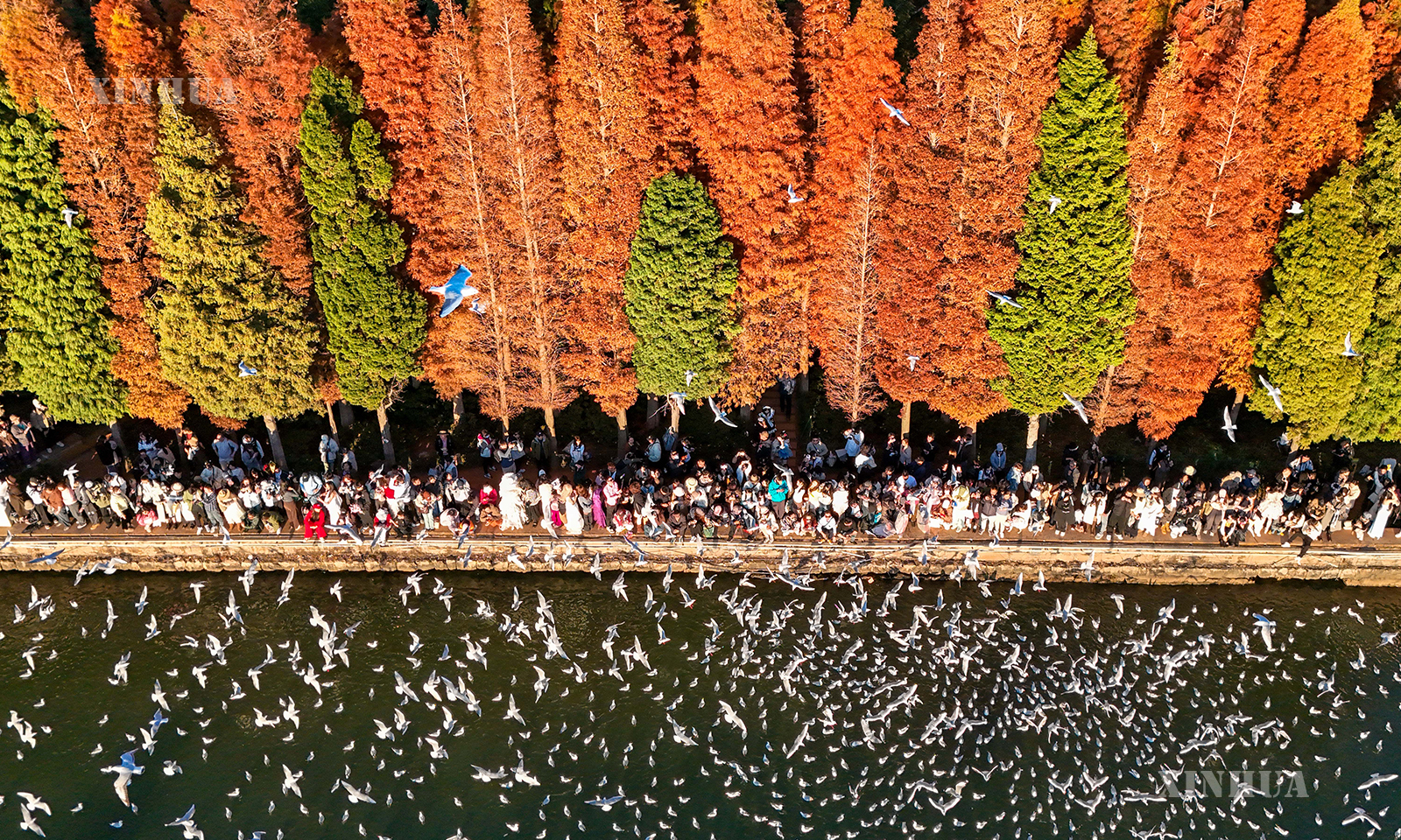 တရုတ်နိုင်ငံ ယူနန်ပြည်နယ် ကူမင်းမြို့ရှိ တျန်းချီရေကန်နံဘေး ဟိုင်ဟုန်ရေဝပ်ဒေသပန်းခြံတွင် ခရီးသွားဧည့်သည်များက စင်ရော်ခေါင်းမဲငှက်များအား အစာကျွေးနေသည်ကို ၂၀၂၅ ခုနှစ် ဒီဇင်ဘာ ၁၀ ရက်က တွေ့ရစဉ် (ဆင်ဟွာ)