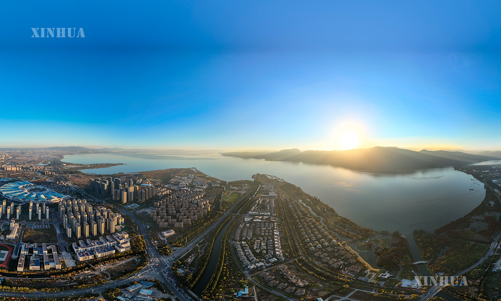 图说1:12月10日在滇池畔拍摄的海洪湿地公园一景(无人机照片)。新华社记者 彭奕凯 摄