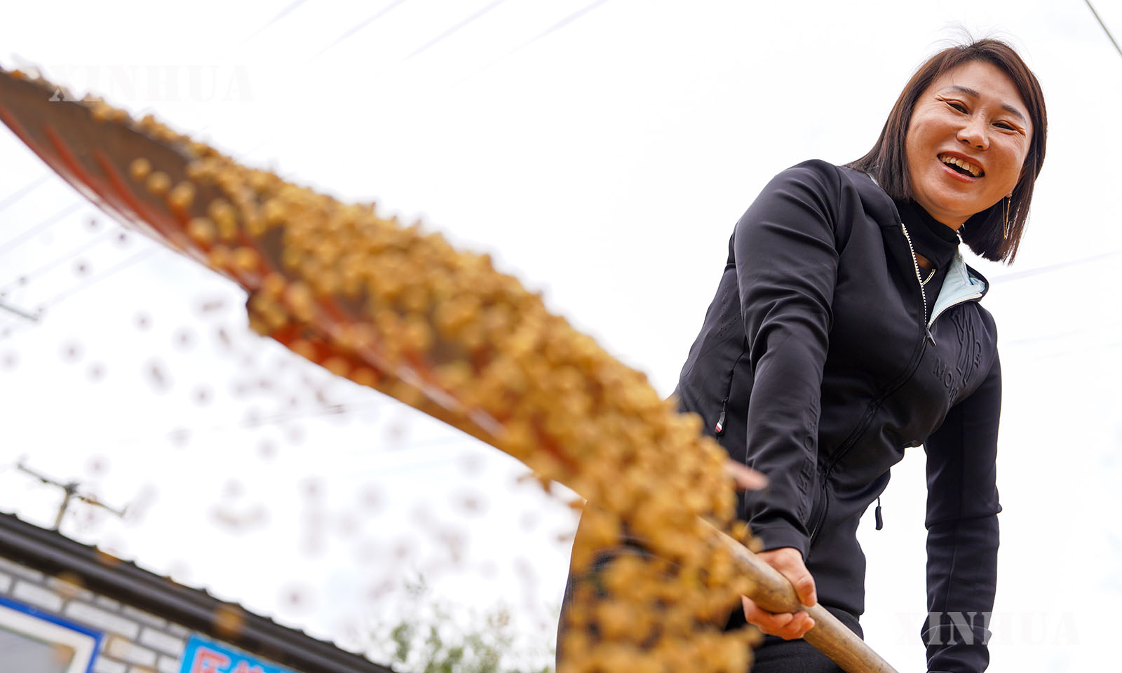 တရုတ်နိုင်ငံ ကျီလျင်ပြည်နယ် စစ်ဖိန်မြို့ လီစုခရိုင် သမဝါယမအသင်းအတွင်း၌ ရိတ်သိမ်းထားသော ပဲပုပ်အား နေလှန်းနေသည့် ဟန်ဖုန့်ရှန်းကို ၂၀၂၅ ခုနှစ် အောက်တိုဘာ ၉ ရက်က တွေ့ရစဉ် (ဆင်ဟွာ)