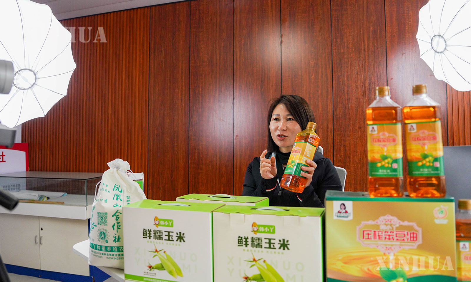 2、10月9日,韩凤香在合作社内直播介绍合作社的农产品。新华社记者 颜麟蕴 摄