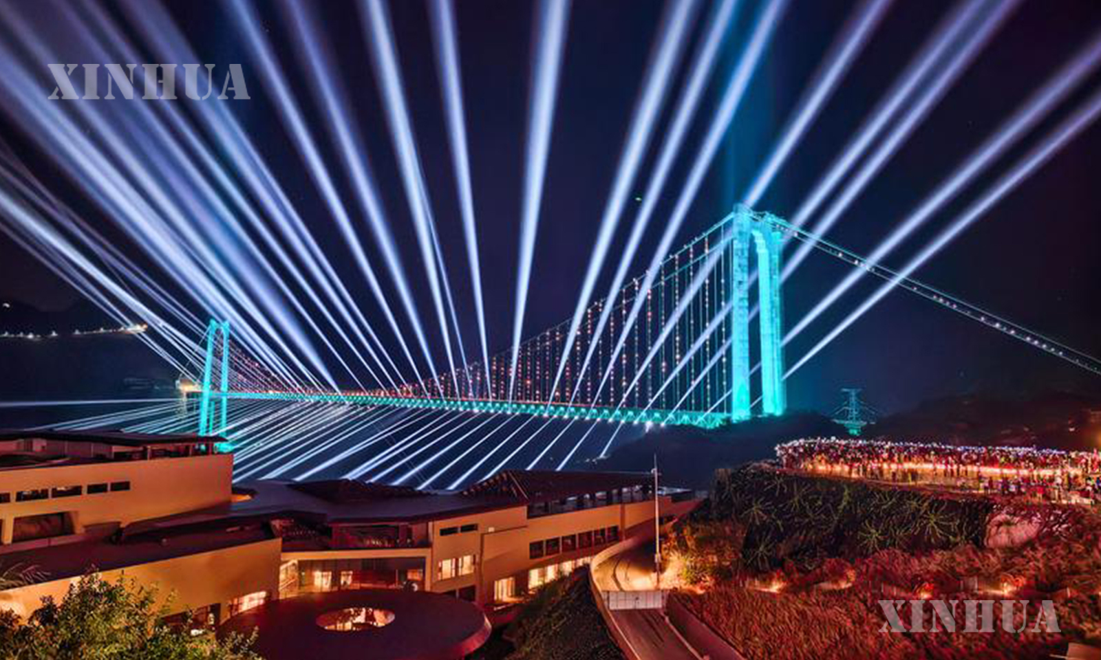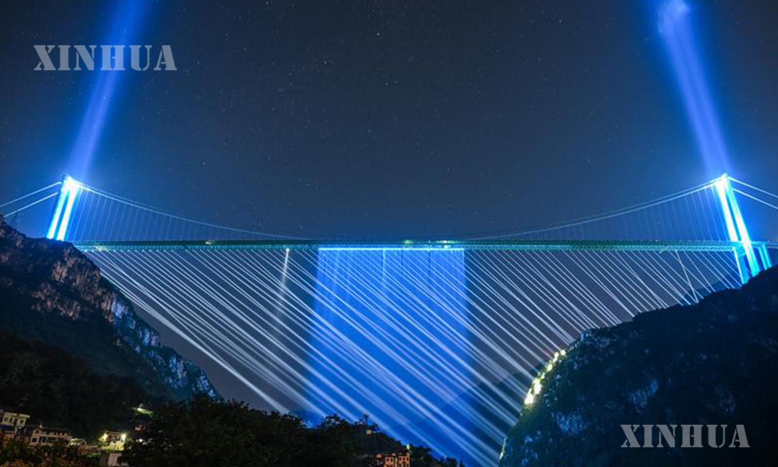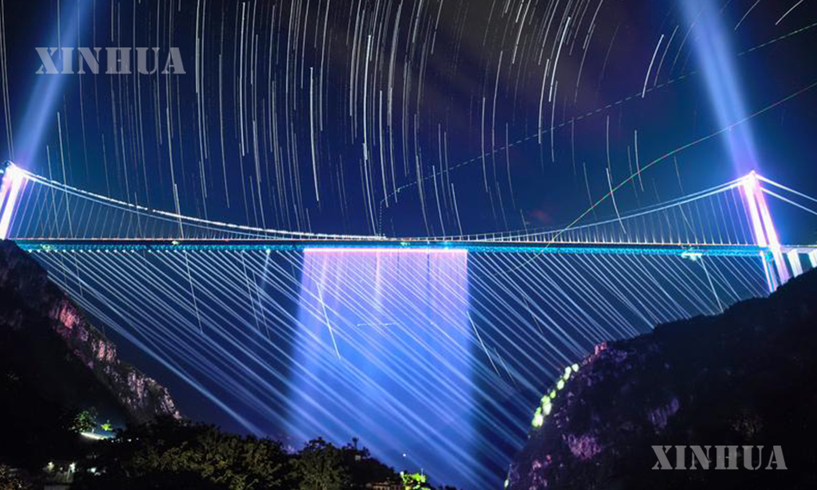 ညချမ်းအခါသမယတွင် ကမ္ဘာ့အမြင့်ဆုံးတံတားသစ်ကြီးဖြစ်သည့် တရုတ်နိုင်ငံ ကွေ့ကျိုးပြည်နယ် ဟွားကျန်းလျှိုမြောင်တံတားကြီး၌ ပေါ်ထွက်လာသည့် အလင်းရောင်အလှပုံရိပ်များသည် ခရီးသွားဧည့်သည်များ လာရောက်ရှုစားရန် ဆွဲဆောင်လျက်ရှိသည်။