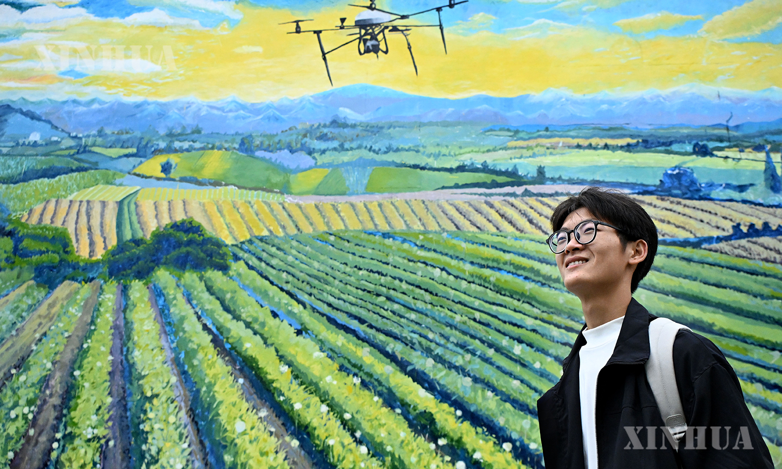 1、10月11日,孟成从青岛农业大学校园内一处大型乡村振兴主题墙绘前经过。 新华社记者 李紫恒 摄