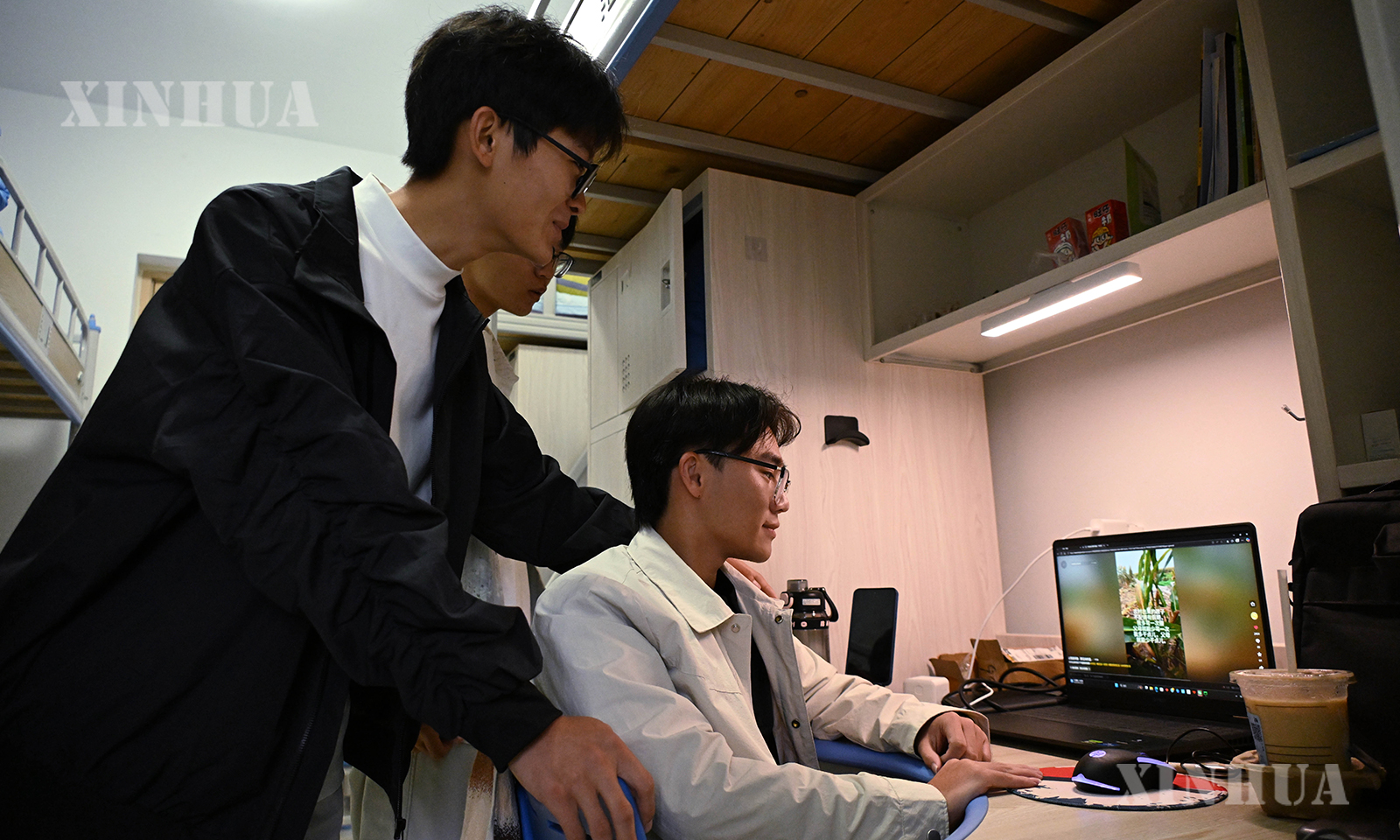 တရုတ်နိုင်ငံ ဆန်းတုန်းပြည်နယ် ချင်းသောင်မြို့ရှိ ချင်းသောင်စိုက်ပျိုးရေးတက္ကသိုလ် ကျောင်းသားအဆောင်၌ မုန့်ချိန် (ဝဲဘက်) က အခန်းဖော်များအား မိမိယခင်က အွန်လိုင်း၌တင်ထားသည့် စိုက်ခင်းအတွင်း အလုပ်လုပ်နေသော ဗီဒီယိုအား မိတ်ဆက်ပြသနေသည်ကို ၂၀၂၅ ခုနှစ် အောက်တိုဘာ ၁၁ ရက်က တွေ့ရစဉ် (ဆင်ဟွာ)
