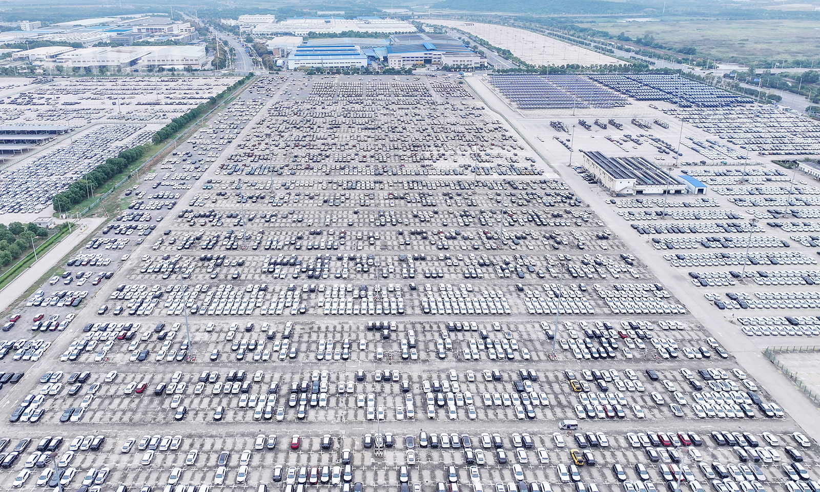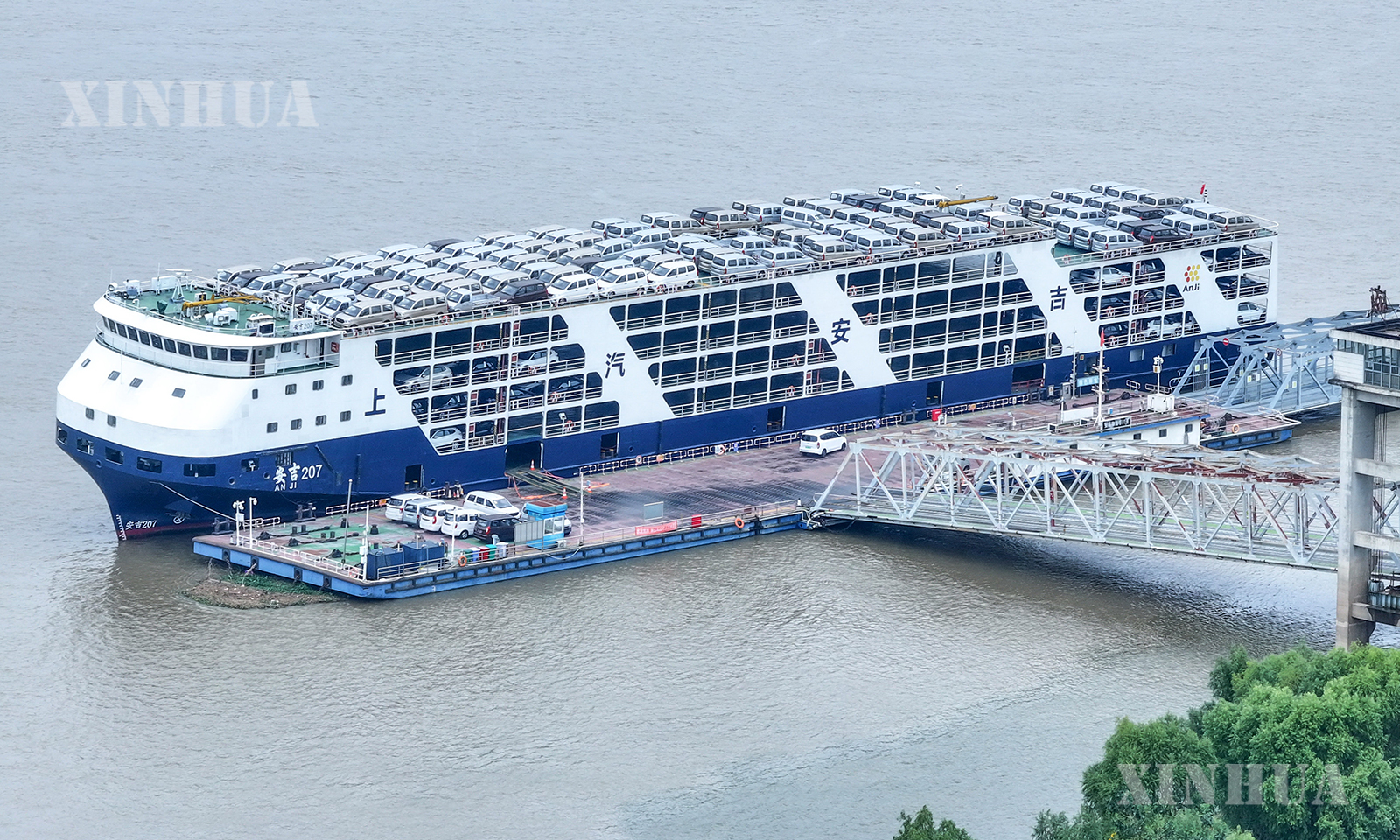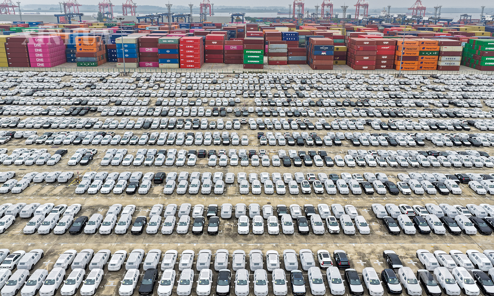 图说1:10月13日在江苏省港口集团南京港龙潭港区拍摄的准备装船出口的汽车(无人机照片)。 新华社发(方东旭摄)