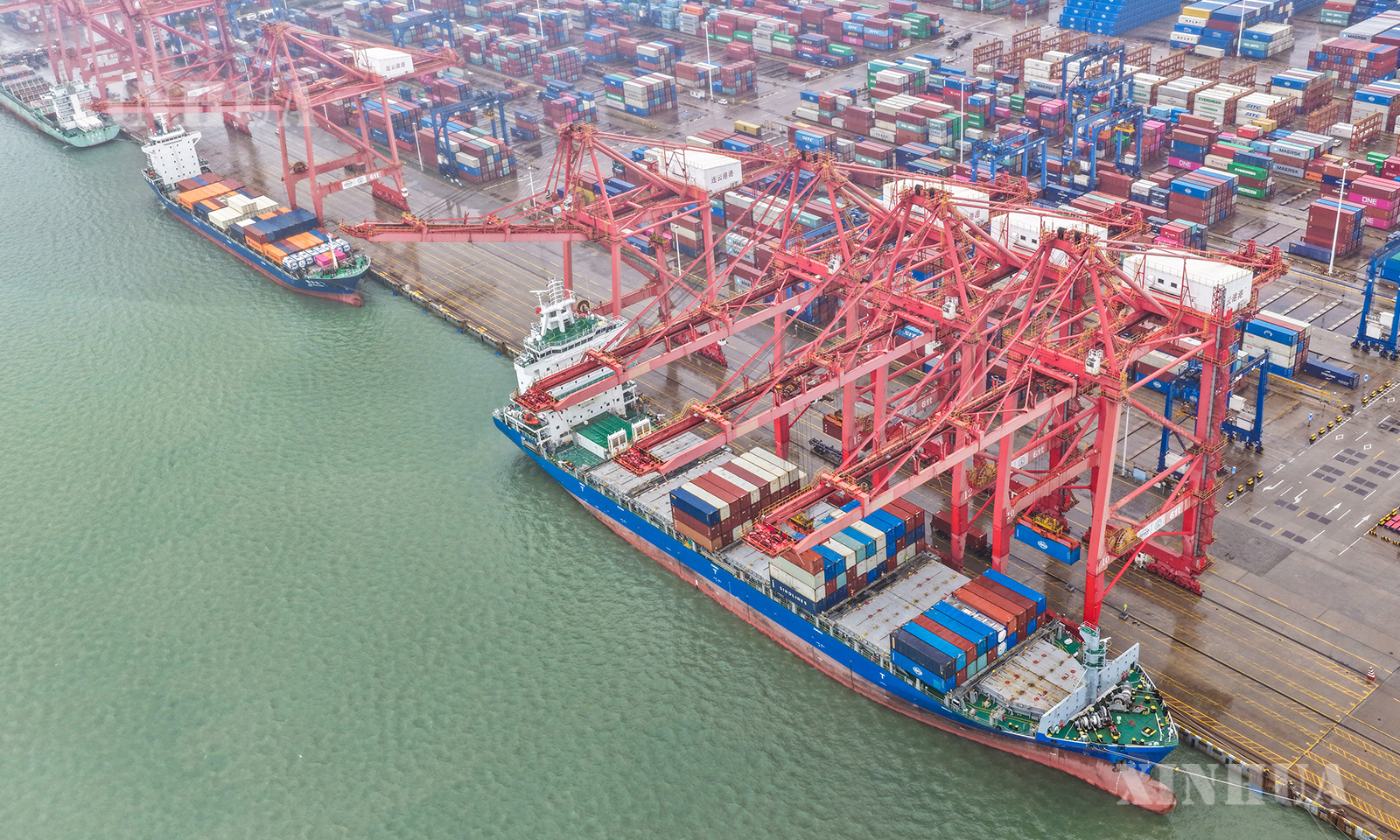 图说2:10月13日,在江苏省连云港港集装箱码头,货轮在装载出口货物(无人机照片)。新华社发(王健民摄)
