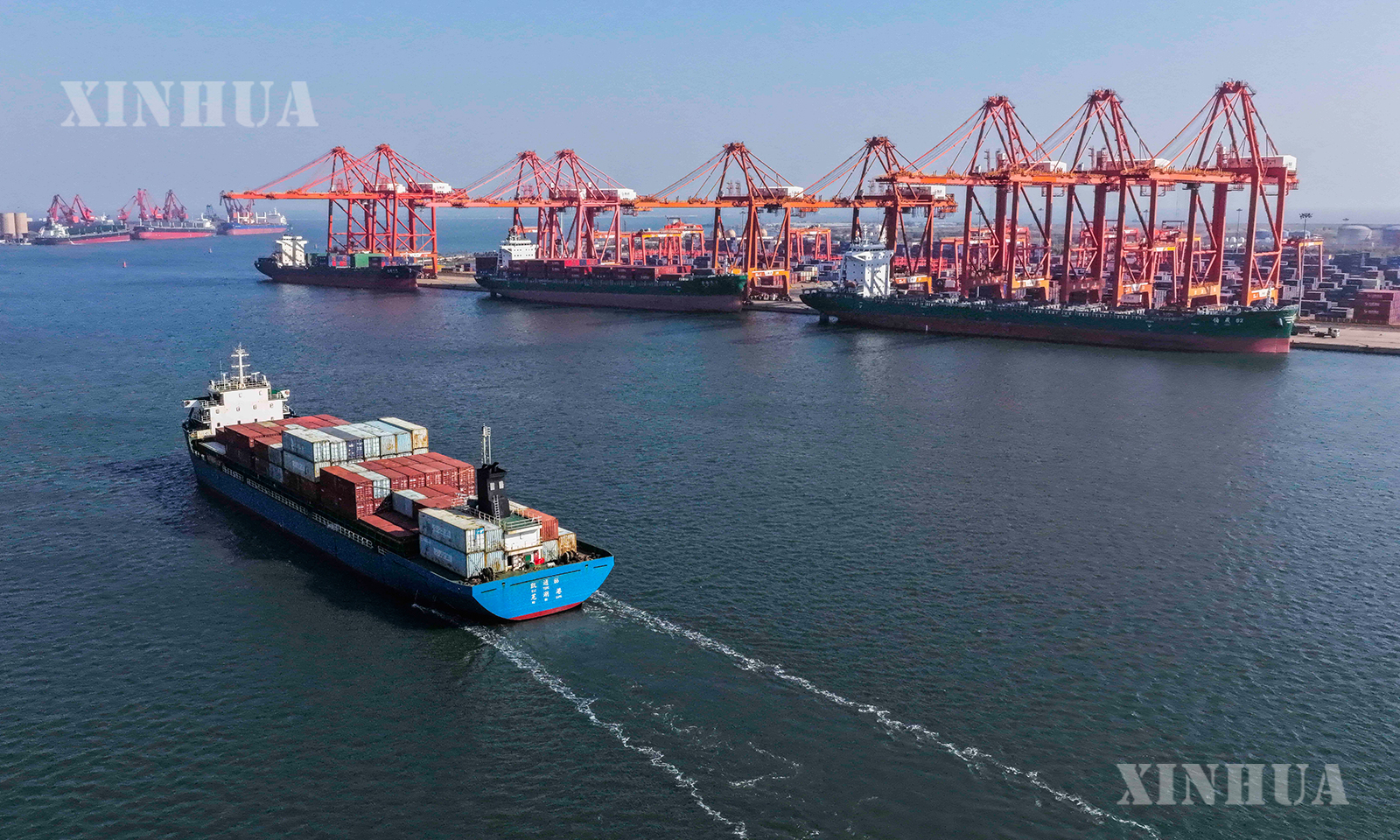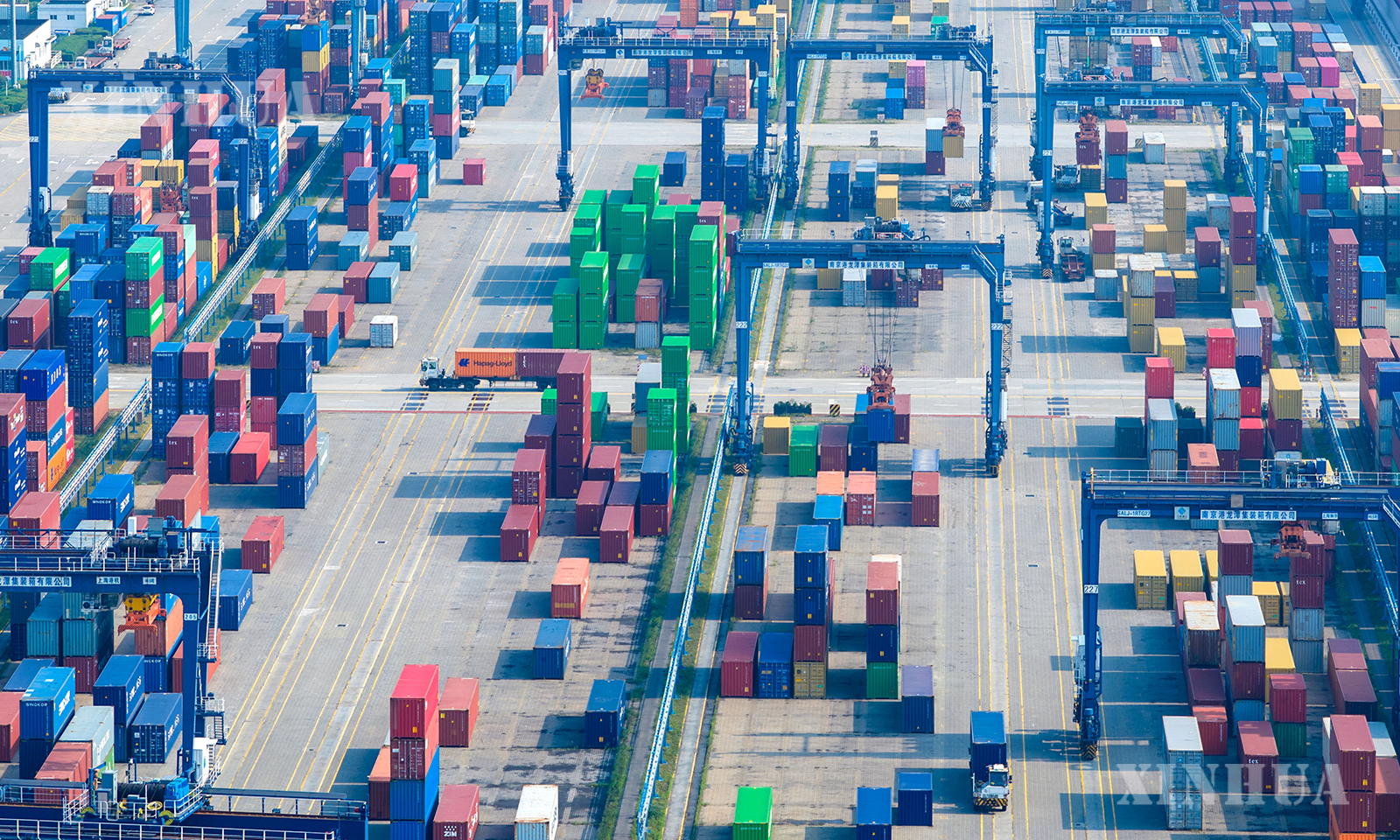 တရုတ်နိုင်ငံ ကျန်းဆူးပြည်နယ် လျန်ယွင်ကန် ကွန်တိန်နာဆိပ်ကမ်းတွင် ကုန်စည်တင်သင်္ဘောတွင် ပို့ကုန်ပစ္စည်းများ တင်ဆောင်နေသည်ကို အောက်တိုဘာ ၁၃ ရက်က ဝေဟင်မှ တွေ့ရစဉ် (ဆင်ဟွာ)