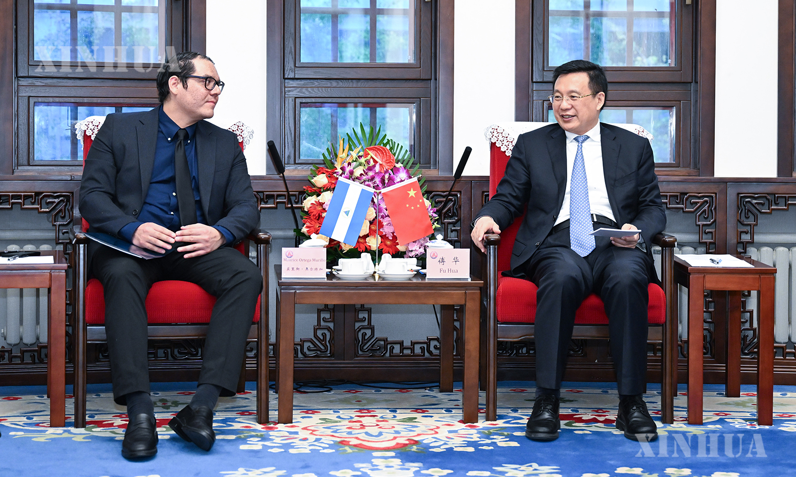 ဆင်ဟွာသတင်းဌာန ဥက္ကဋ္ဌ ဖုဟွာနှင့် နီကာရာဂွါနိုင်ငံ ၁၃ ရုပ်သံလွှင့်ချန်နယ် အကြီးအကဲ Maurice Ortega Murillo တို့ တရုတ်နိုင်ငံ ပေကျင်းမြို့၌ ၂၀၂၅ ခုနှစ် အောက်တိုဘာ ၁၄ ရက်က တွေ့ဆုံဆွေးနွေးစဉ် (ဆင်ဟွာ)