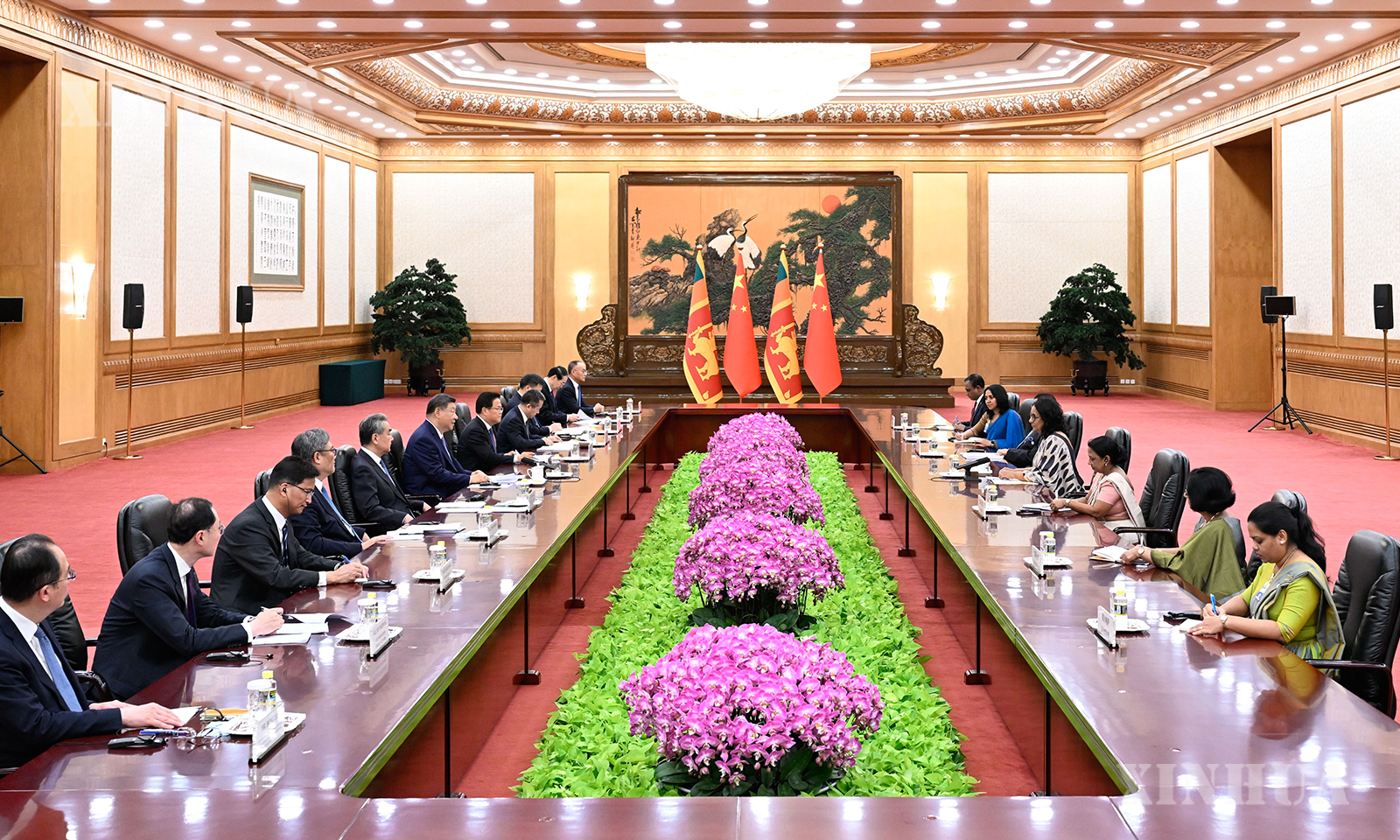 တရုတ်နိုင်ငံ သမ္မတ ရှီကျင့်ဖိန်နှင့် တရုတ်နိုင်ငံသို့လာရောက်၍ ကမ္ဘာ့အမျိုးသမီးခေါင်းဆောင်များ ထိပ်သီးအစည်းအဝေး တက်ရောက်သည့် သီရိလင်္ကာနိုင်ငံ ဝန်ကြီးချုပ် Harini Amarasuriya တရုတ်နိုင်ငံ ပေကျင်းမြို့ ပြည်သူ့ခန်းမဆောင်၌ ၂၀၂၅ ခုနှစ် အောက်တိုဘာ ၁၄ ရက် နံနက်ပိုင်းက တွေ့ဆုံဆွေးနွေးစဉ် (ဆင်ဟွာ)