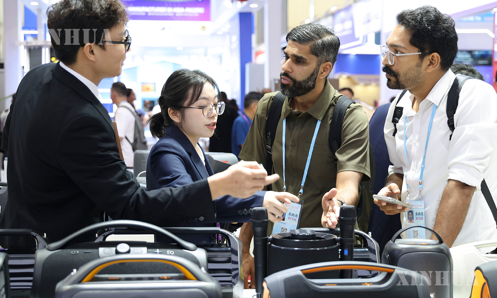 တရုတ်နိုင်ငံ ကွမ်ကျိုးမြို့၌ ကျင်းပသည့် ၁၃၈ ကြိမ်မြောက် တရုတ်ပို့ကုန်သွင်းကုန်ပြပွဲ (ကွမ်ကျိုးကုန်စည်ပြပွဲ) တွင် စပီကာထုတ်ကုန်များအကြောင်း မေးမြန်းနေသော ဧည့်သည်ကုန်သည်အား ၂၀၂၅ ခုနှစ် အောက်တိုဘာ ၁၅ ရက်က တွေ့ရစဉ် (ဆင်ဟွာ)