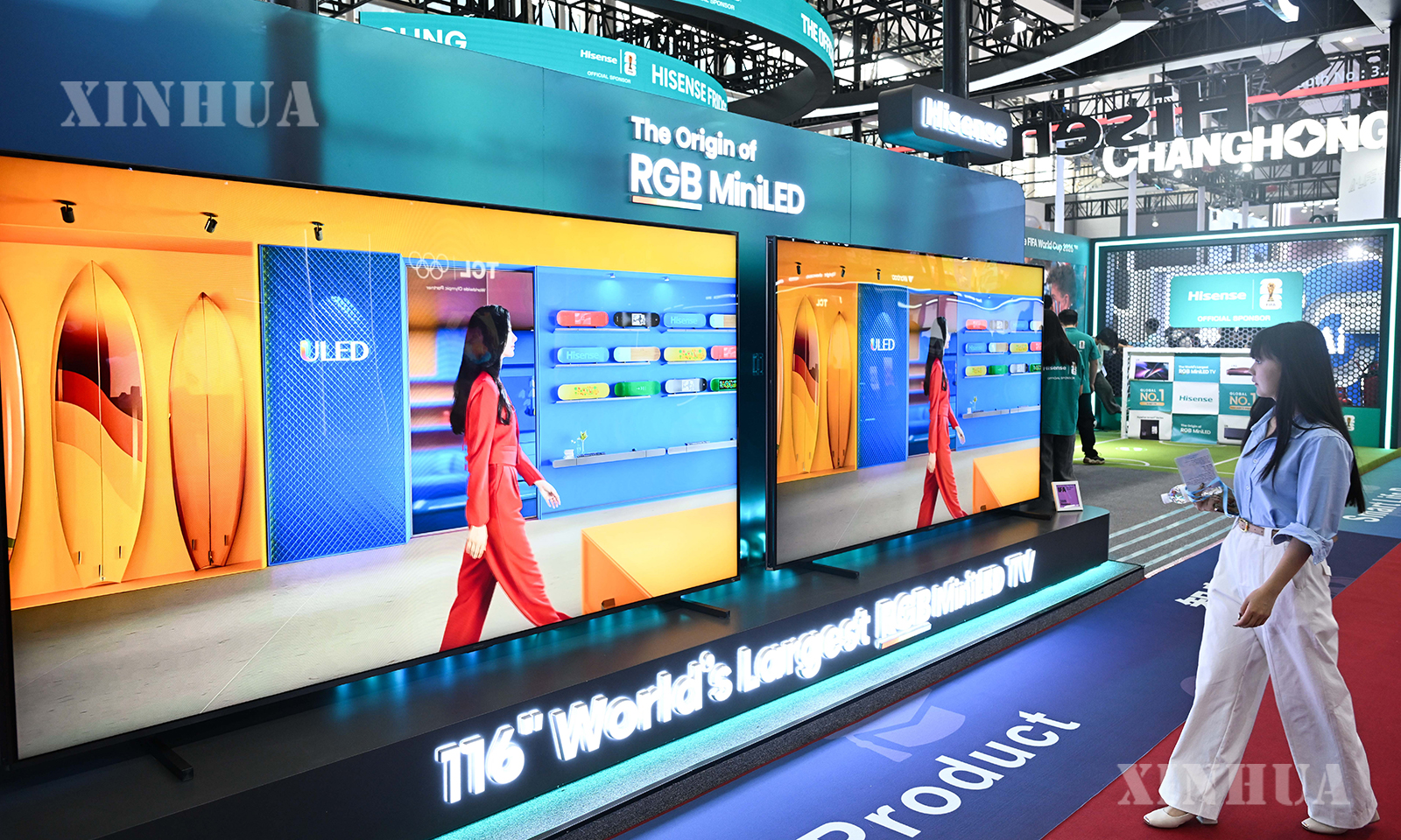 တရုတ်နိုင်ငံ ကွမ်ကျိုးမြို့၌ ကျင်းပသည့် ၁၃၈ ကြိမ်မြောက် တရုတ်ပို့ကုန်သွင်းကုန်ပြပွဲ (ကွမ်ကျိုးကုန်စည်ပြပွဲ) စမတ်လူနေမှုဘဝဇုန်ရှိ Hisense ပြခန်းတွင် ပြသထားသော တီဗီအား လေ့လာကြည့်ရှုနေသူကို ၂၀၂၅ ခုနှစ် အောက်တိုဘာ ၁၅ ရက်က တွေ့ရစဉ် (ဆင်ဟွာ)