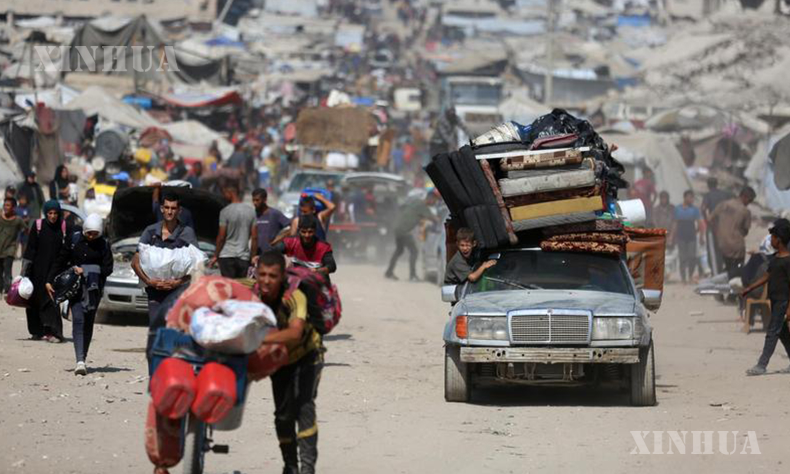 1. 9月18日,在加沙城以西的沿海公路上,人们运载着生活用品,汇入人潮向南撤离。新华社发(里泽克·阿卜杜勒贾瓦德摄)