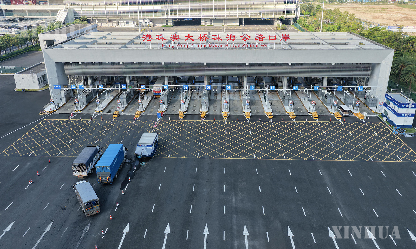 1、车辆准备通过港珠澳大桥珠海公路口岸边检站(10月19日摄,无人机照片)。新华社记者 邓华 摄