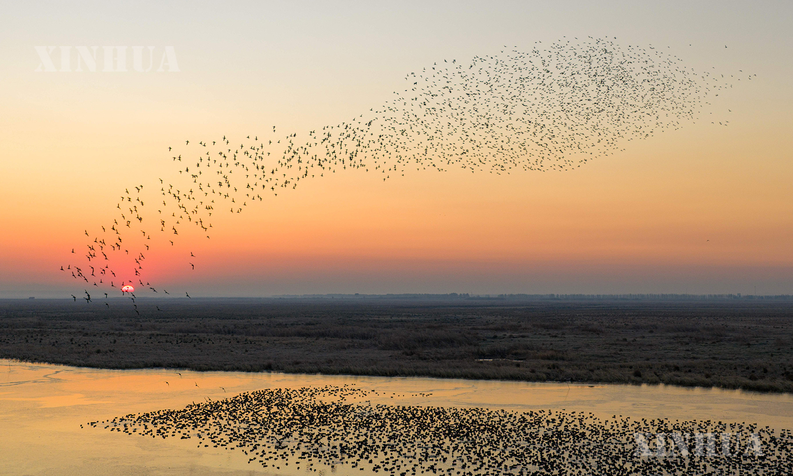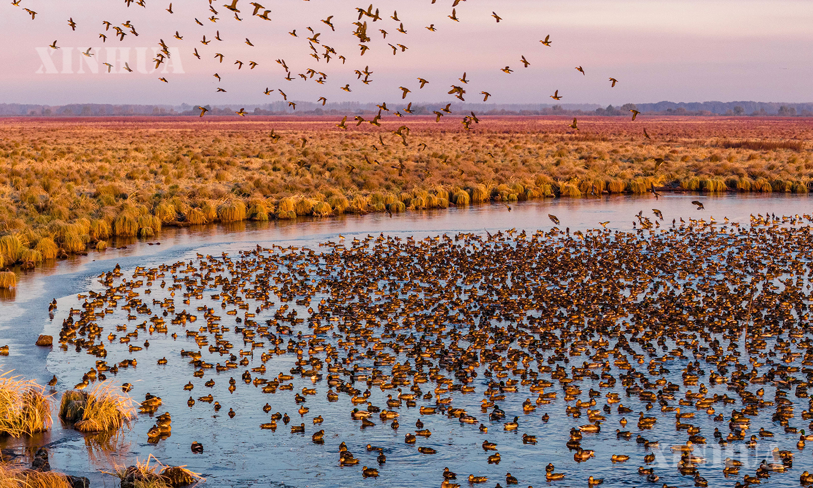 တရုတ်နိုင်ငံ ဟေးလုံကျန်းပြည်နယ် နောင်လိမြစ် အမျိုးသားအဆင့် သဘာဝပတ်ဝန်းကျင် ထိန်းသိမ်းရေးဇုန်၌ ရွှေ့ပြောင်းငှက်များက အရုဏ်ဦးအချိန်တွင် စုဖွဲ့ပျံသန်းသွားလာနေသည်ကို ၂၀၂၅ ခုနှစ် အောက်တိုဘာ ၂၂ ရက်က တွေ့ရစဉ် (ဆင်ဟွာ)