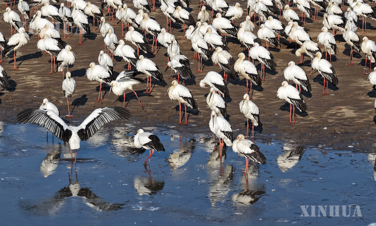 တရုတ်နိုင်ငံ ဟေးလုံကျန်းပြည်နယ် ဆုန်းဟွားမြစ် ဖုကျင်မြစ်အပိုင်း ကမ်းရိုးတန်းတစ်လျှောက် ရေဝပ်ဒေသ၌ စုစည်းနေသော အရှေ့တိုင်းကြိုးကြာဖြူ (Oriental stork) အား ၂၀၂၅ ခုနှစ် အောက်တိုဘာ ၂၂ ရက်က တွေ့ရစဉ် (ဆင်ဟွာ)