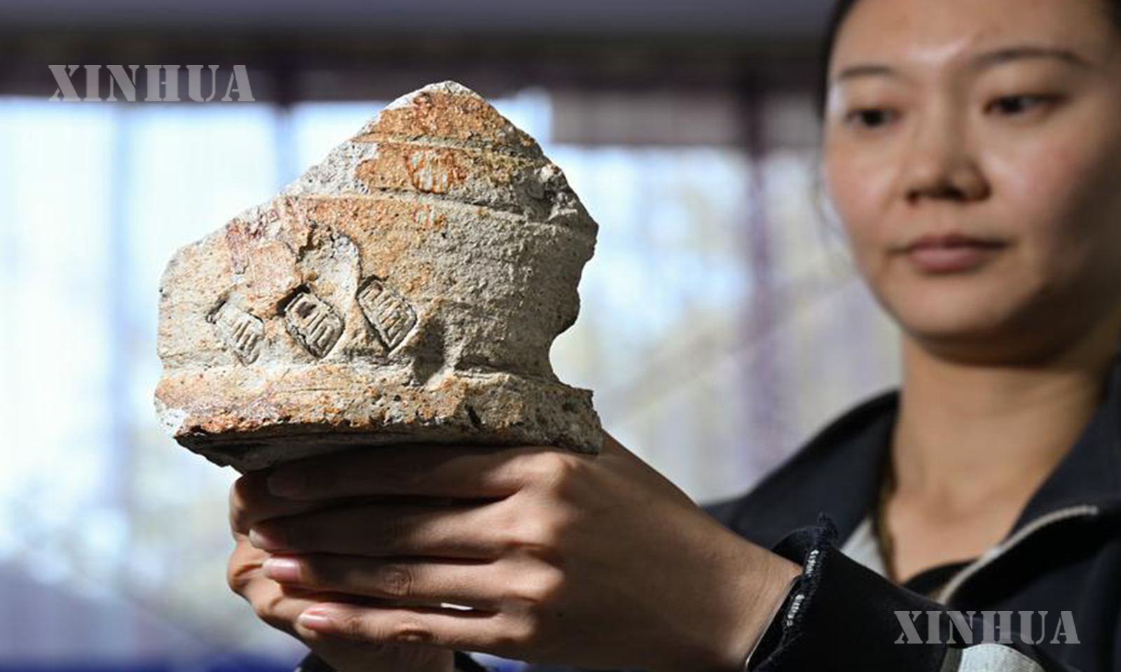 1. 一位工作人员在苏峪口瓷窑址考古队文物库房内展示遗址出土的带有“官”字款的匣钵残片(10月13日摄)。