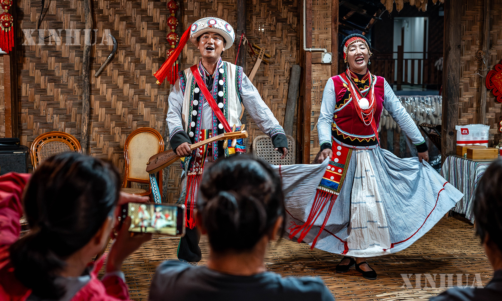 တရုတ်နိုင်ငံ ယူနန်ပြည်နယ်ရှိ လောင်မူသိန်းရွာမှ ရွာသူများဖြစ်သော ကျန်းကွမ်းရှင်း (ဝဲဘက်) နှင့် လီယွိလန်တို့က တည်းခိုခန်းတွင် ခရီးသွားဧည့်သည်များအား တိုင်းရင်းသားအကဖြင့် ကပြတင်ဆက်နေသည်ကို ၂၀၂၅ ခုနှစ် အောက်တိုဘာ ၁၉ ရက်က တွေ့ရစဉ် (ဆင်ဟွာ)