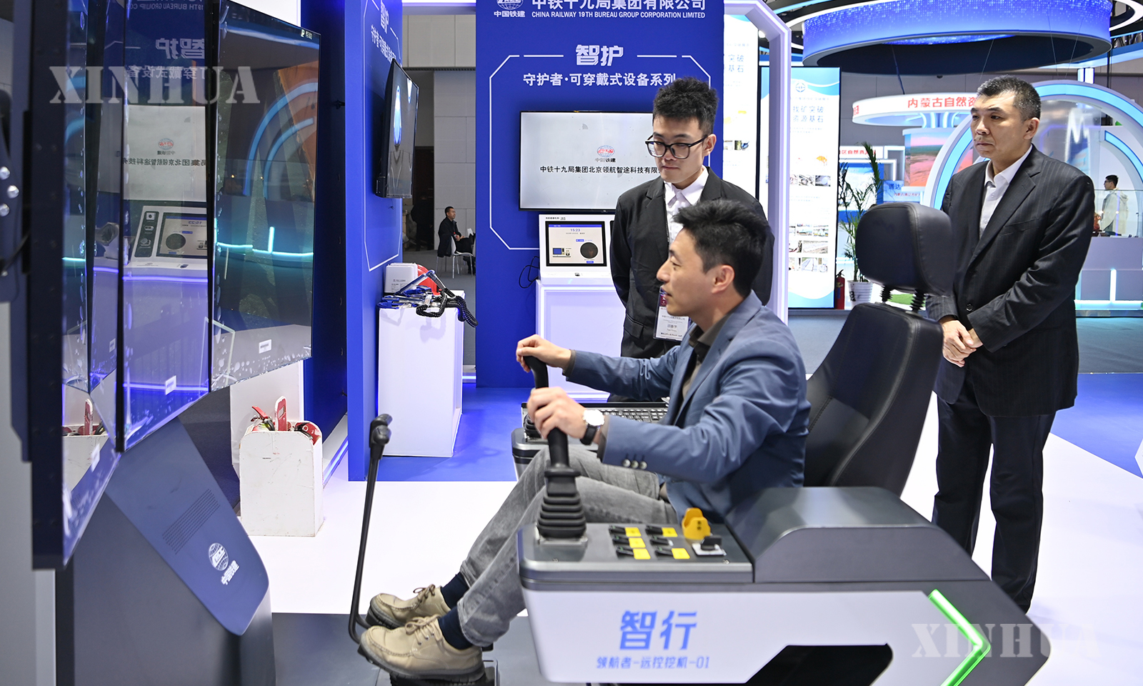 သတ္တုတူးဖော်ရေး စက်ယန္တရားနှင့် ပစ္စည်းကိရိယာပြပွဲတွင် တက်ရောက်သူတစ်ဦးက အဝေးထိန်း မြေတူးစက်များကို ကိုယ်တိုင်စမ်းသပ်လုပ်ဆောင်နေသည်ကို အောက်တိုဘာ ၂၃ ရက်က တွေ့ရစဉ် (ဆင်ဟွာ)