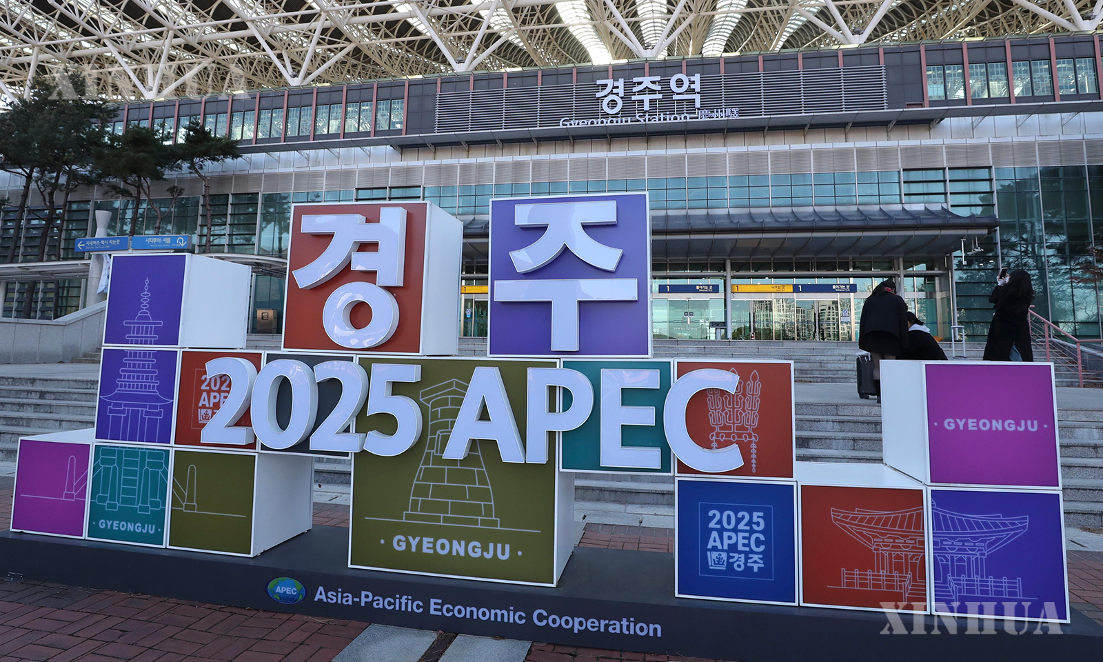 图说:这是2024年12月31日在韩国庆州火车站前拍摄的亚太经合组织领导人非正式会议的宣传标语。新华社记者 姚琪琳 摄