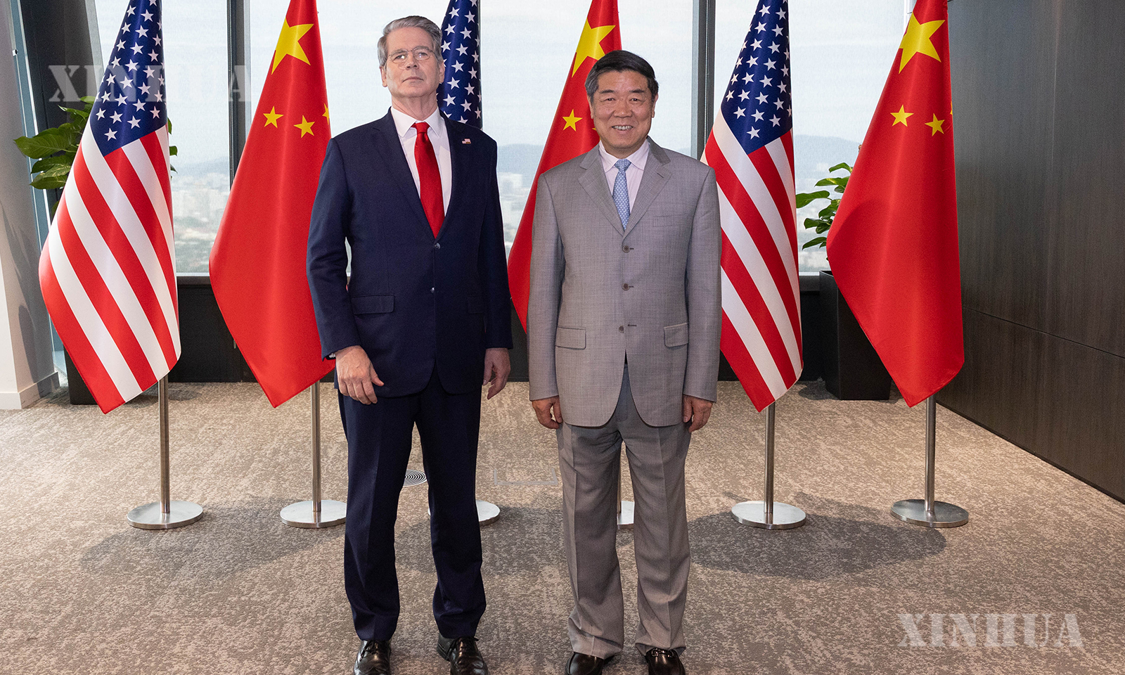 ဆွေးနွေးပွဲမတိုင်မီ တရုတ်ကွန်မြူနစ်ပါတီ ဗဟိုကော်မတီ နိုင်ငံရေးဗျူရိုအဖွဲ့ဝင်၊ နိုင်ငံတော်ကောင်စီ ဒုတိယဝန်ကြီးချုပ် ဟယ်လိဖုန်းနှင့် အမေရိကန်နိုင်ငံ ဘဏ္ဍာရေးဝန်ကြီး Scott Bessent တို့ စုပေါင်းဓာတ်ပုံရိုက်ကူးနေသည်ကို ၂၀၂၅ ခုနှစ် အောက်တိုဘာ ၂၅ ရက်က တွေ့ရစဉ် (ဆင်ဟွာ)