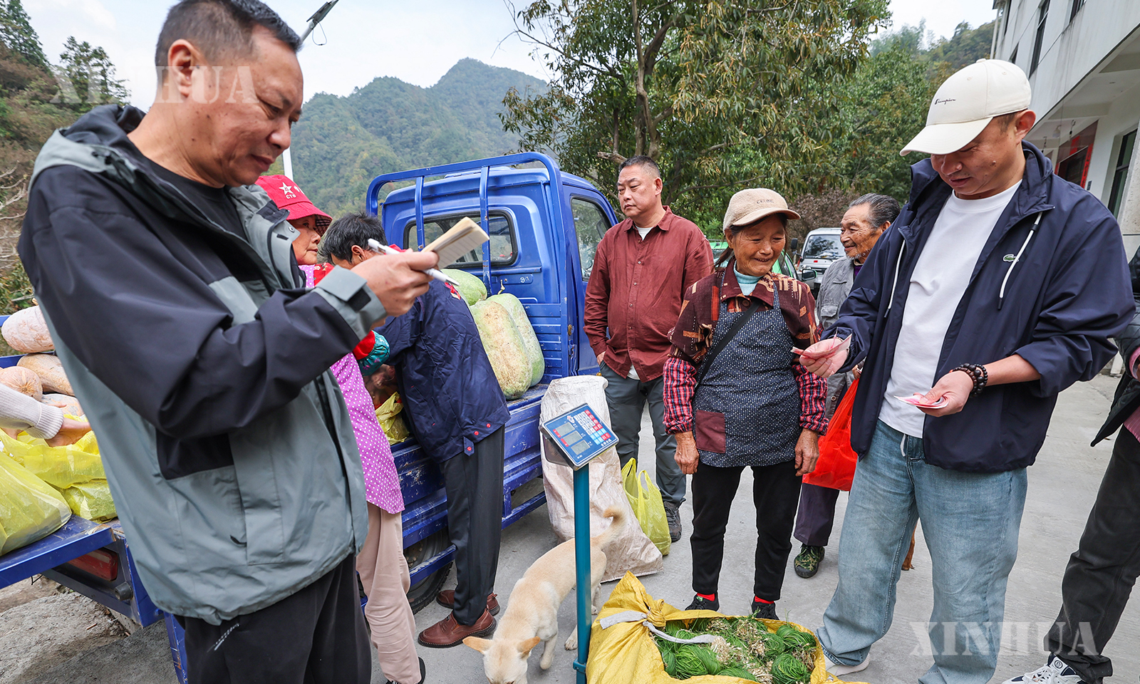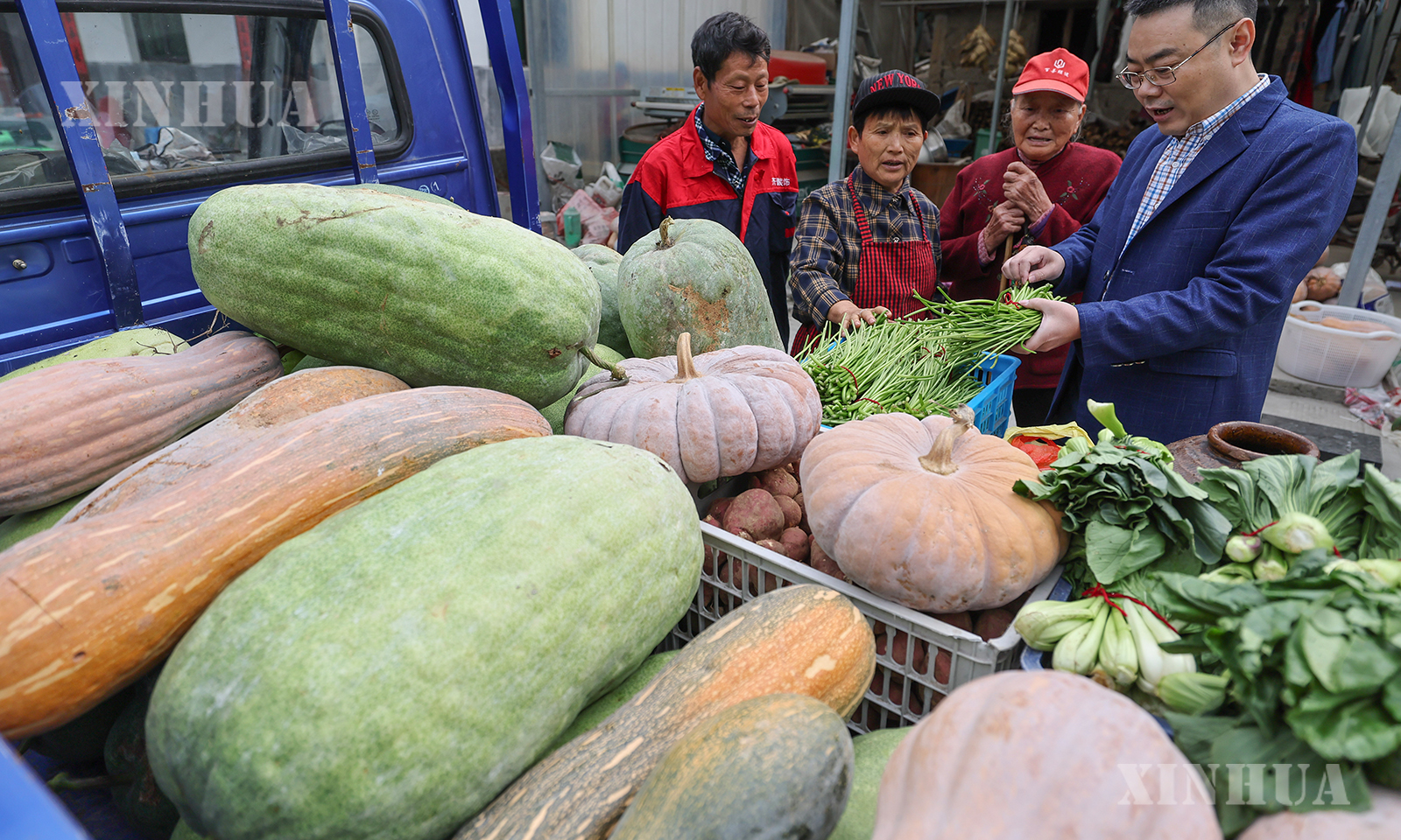 တရုတ်နိုင်ငံ စားသောက်လုပ်ငန်း တာဝန်ခံဖြစ်သူ ရှောက်ရှန်ပင်း (ယာဘက် ပထမ) က ကွမ်းထျန်ကျေးရွာတွင် ကျေးရွာသူကျေးရွာသားများ စိုက်ပျိုးထားသော ဟင်းသီးဟင်းရွက်များ ဝယ်ယူနေသည်ကို အောက်တိုဘာ ၂၇ ရက်က တွေ့ရစဉ် (ဆင်ဟွာ)