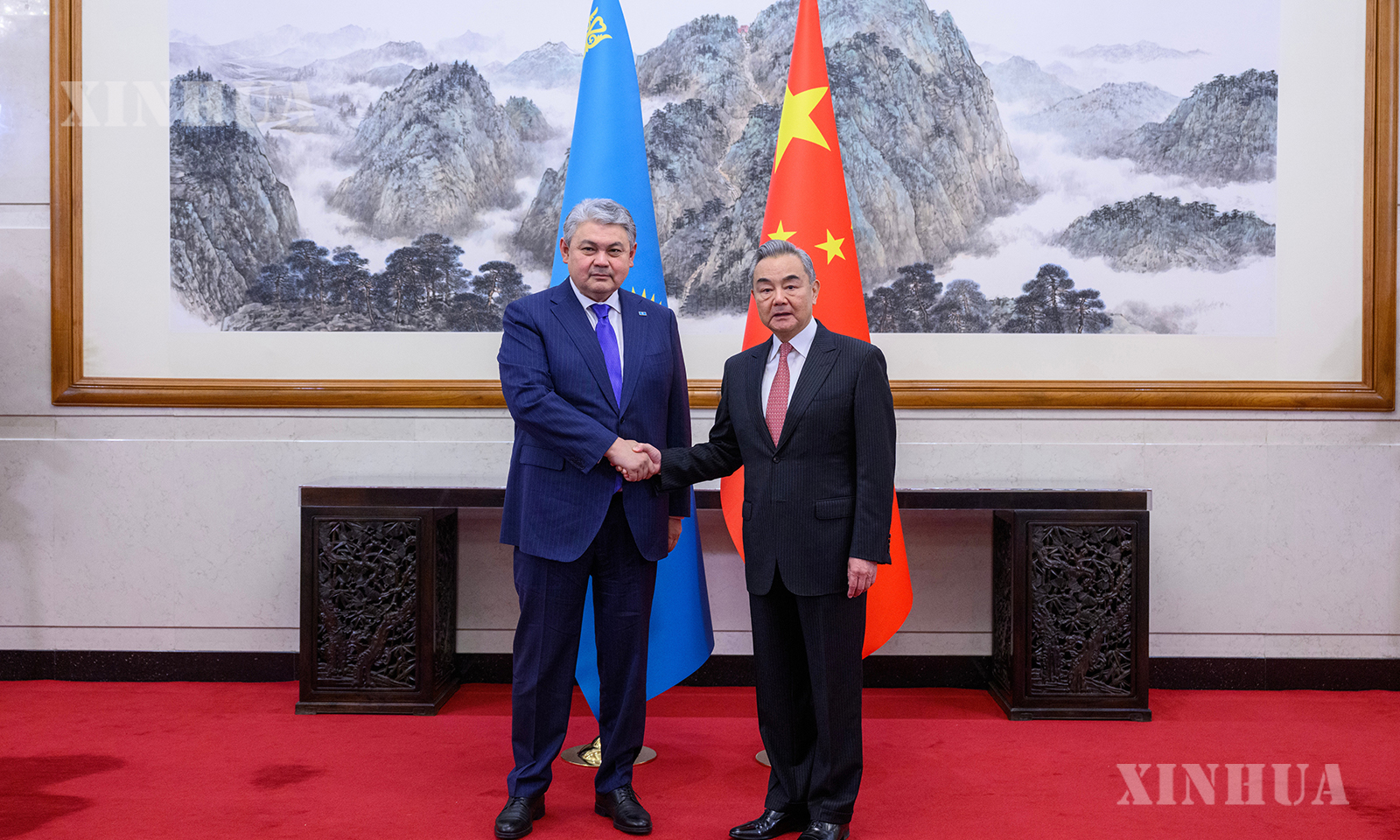 တရုတ်နိုင်ငံ ပေကျင်းမြို့၌ တရုတ်ကွန်မြူနစ်ပါတီ ဗဟိုကော်မတီ နိုင်ငံရေးဗျူရိုအဖွဲ့ဝင်၊ နိုင်ငံခြားရေးဝန်ကြီး ဝမ်ရိနှင့် ကာဇက်စတန် နိုင်ငံခြားရေးဝန်ကြီး Yermek Kosherbayev တို့ အောက်တိုဘာ ၂၈ ရက်က တွေ့ဆုံဆွေးနွေးစဉ် (ဆင်ဟွာ)
