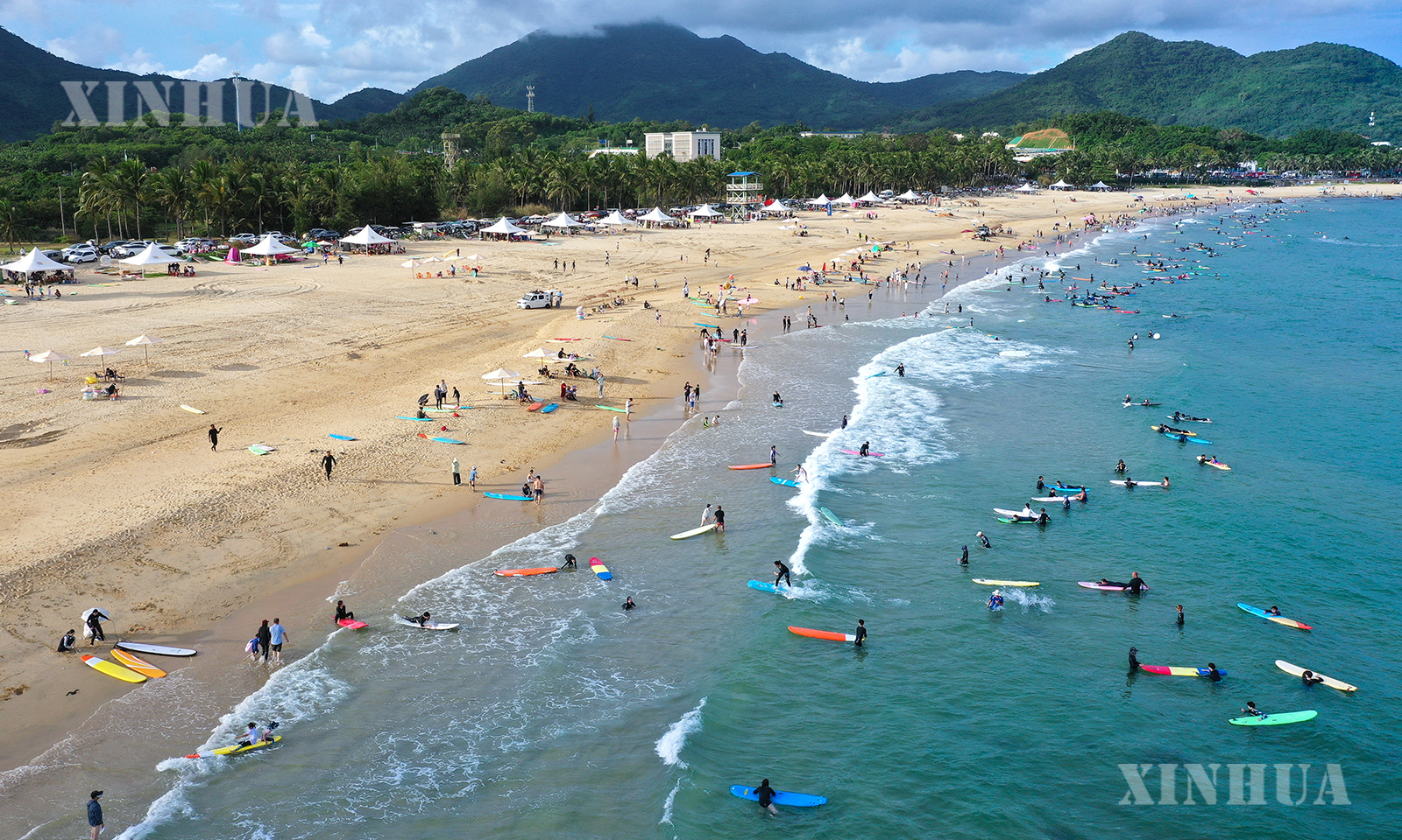 1、10月2日,游客在海南万宁日月湾冲浪(无人机照片)。 新华社记者 郭程 摄