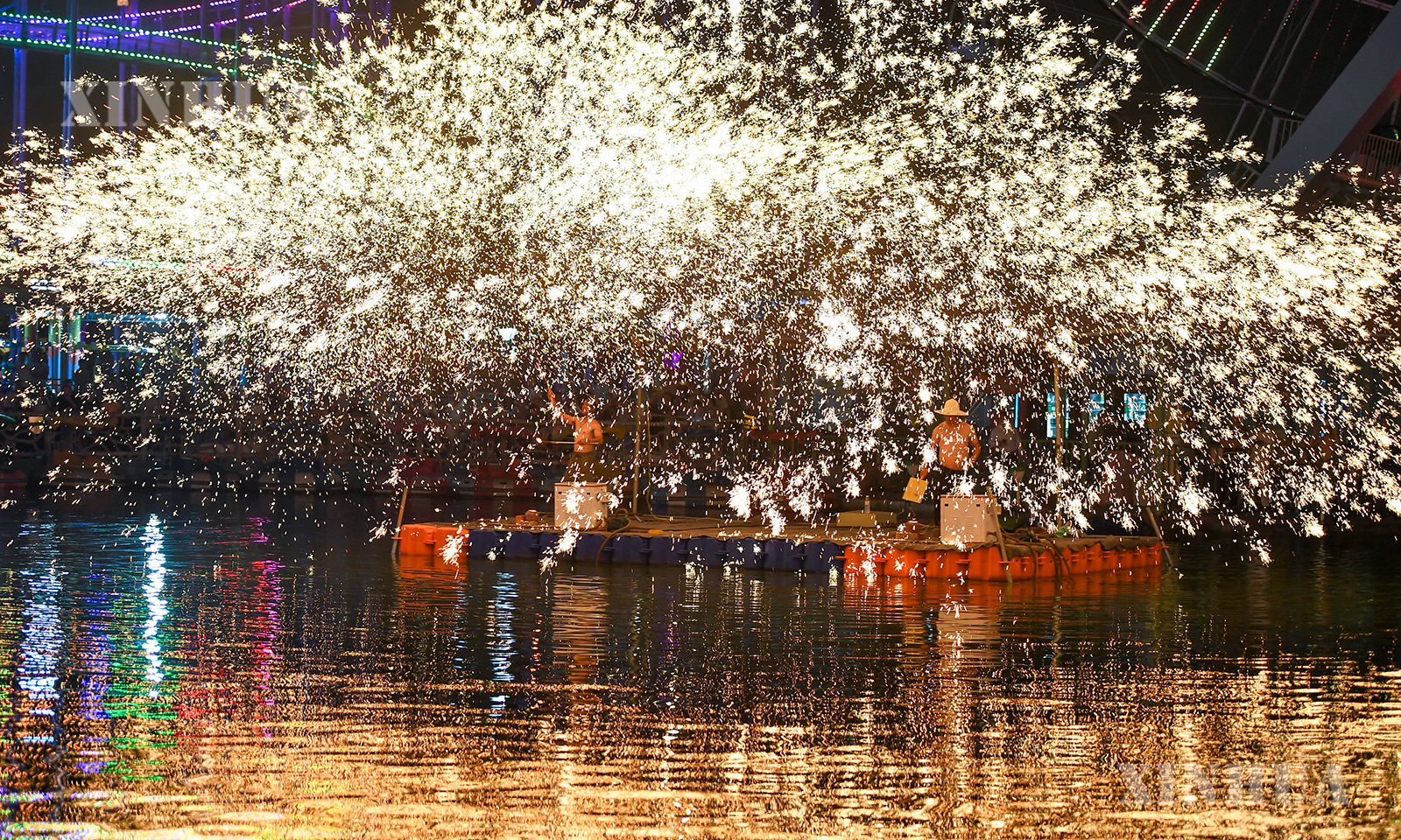 တရုတ်နိုင်ငံ ကျန်းဆူးပြည်နယ် နန်ကျင်းမြို့ ချီးချောင်ဝုန့် ရေဝပ်ဒေသဥယျာဉ်အတွင်း၌ ဒြပ်မဲ့ ယဉ်ကျေးမှုအမွေအနှစ် လက်ဆင့်ကမ်းသူက သံသွန်းမီးပန်း ဖျော်ဖြေတင်ဆက်နေသည်ကို ၂၀၂၅ ခုနှစ် အောက်တိုဘာ ၂ ရက်က တွေ့ရစဉ် (ဆင်ဟွာ)