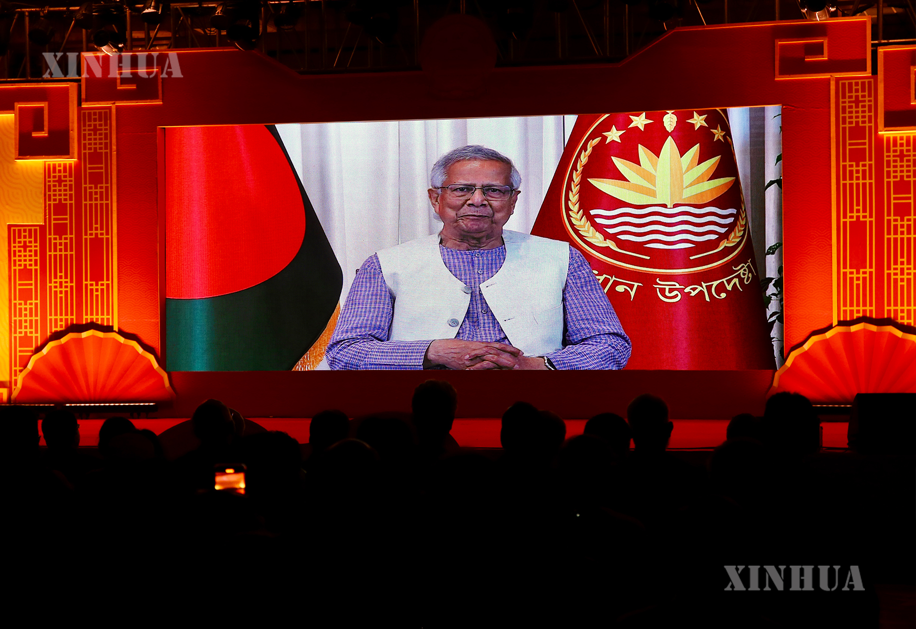 ဘင်္ဂလားဒေ့ရှ်နိုင်ငံ မြို့တော်ဒါကာ၌ ကျင်းပသည့် တရုတ်ပြည်သူ့သမ္မတနိုင်ငံ တည်ထောင်ခြင်း ၇၆ နှစ်ပြည့် တရုတ်-ဘင်္ဂလားဒေ့ရှ် သံတမန်ဆက်ဆံရေး ထူထောင်ခြင်း နှစ် ၅၀ ပြည့် အထိမ်းအမှတ် ဂုဏ်ပြုဧည့်ခံပွဲ၌ ဘင်္ဂလားဒေ့ရှ်နိုင်ငံ ယာယီအစိုးရ ထိပ်တန်းအကြံပေး Muhammad Yunus ဗီဒီယိုဖြင့် အမှာစကားပြောကြားနေသည်ကို ၂၀၂၅ ခုနှစ် စက်တင်ဘာ ၁၇ ရက်က တွေ့ရစဉ် (ဆင်ဟွာ)