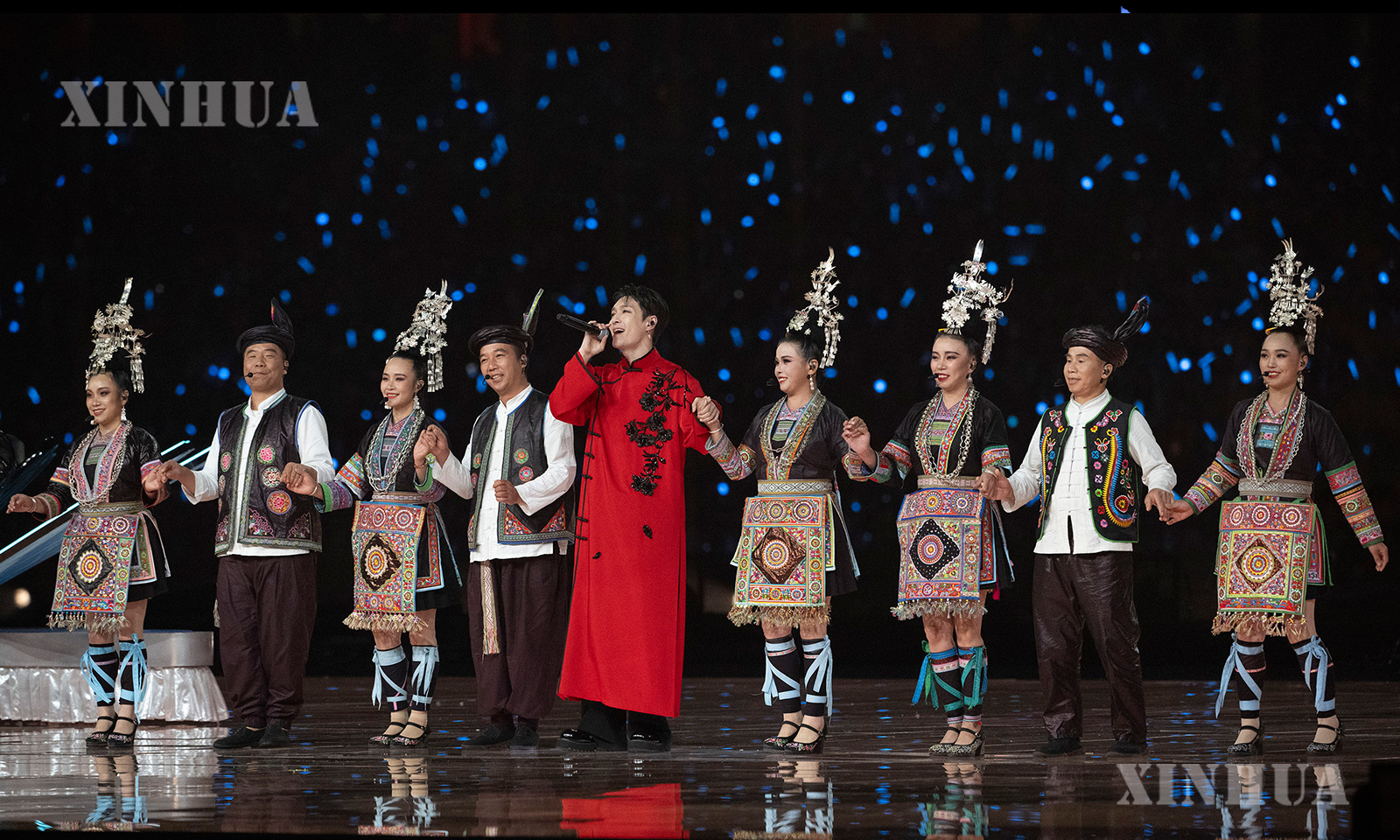 2、10月6日,张艺兴与少数民族歌者在演唱会上表演。新华社记者 才扬 摄